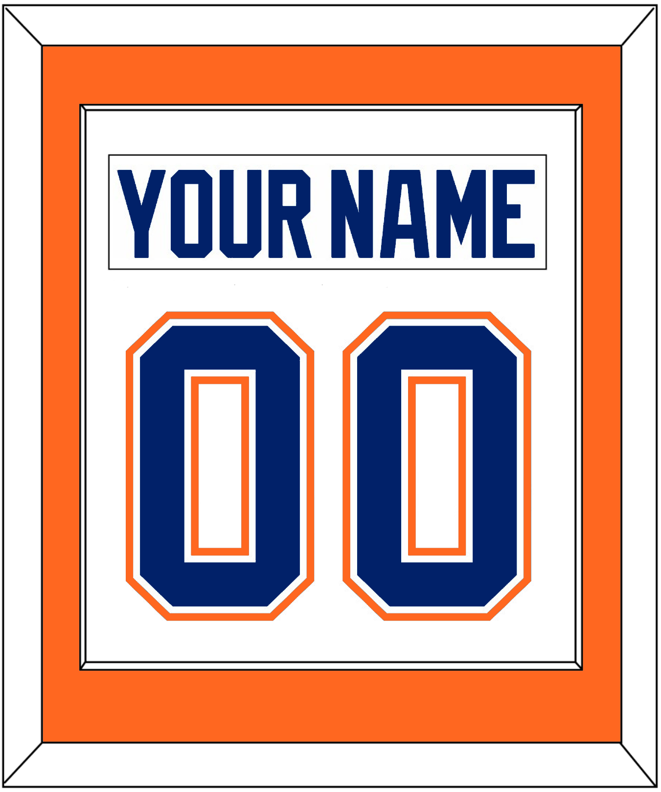 Edmonton Home White Jersey (1981 Through 1994) Nameplate & Number (From The Back Of The Jersey). Single Mat Cut: Orange Mat With White Nameplate And Blue Number Mounted On A White Mat. White Or Black Frame.