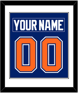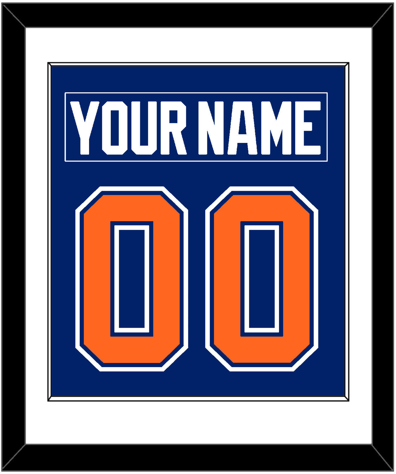 Edmonton Road Blue Jersey (1981 Through 1994) Nameplate & Number (From The Back Of The Jersey). Single Mat Cut: White Mat With Blue Nameplate And Orange Number Mounted On A Blue Mat. Black Frame.