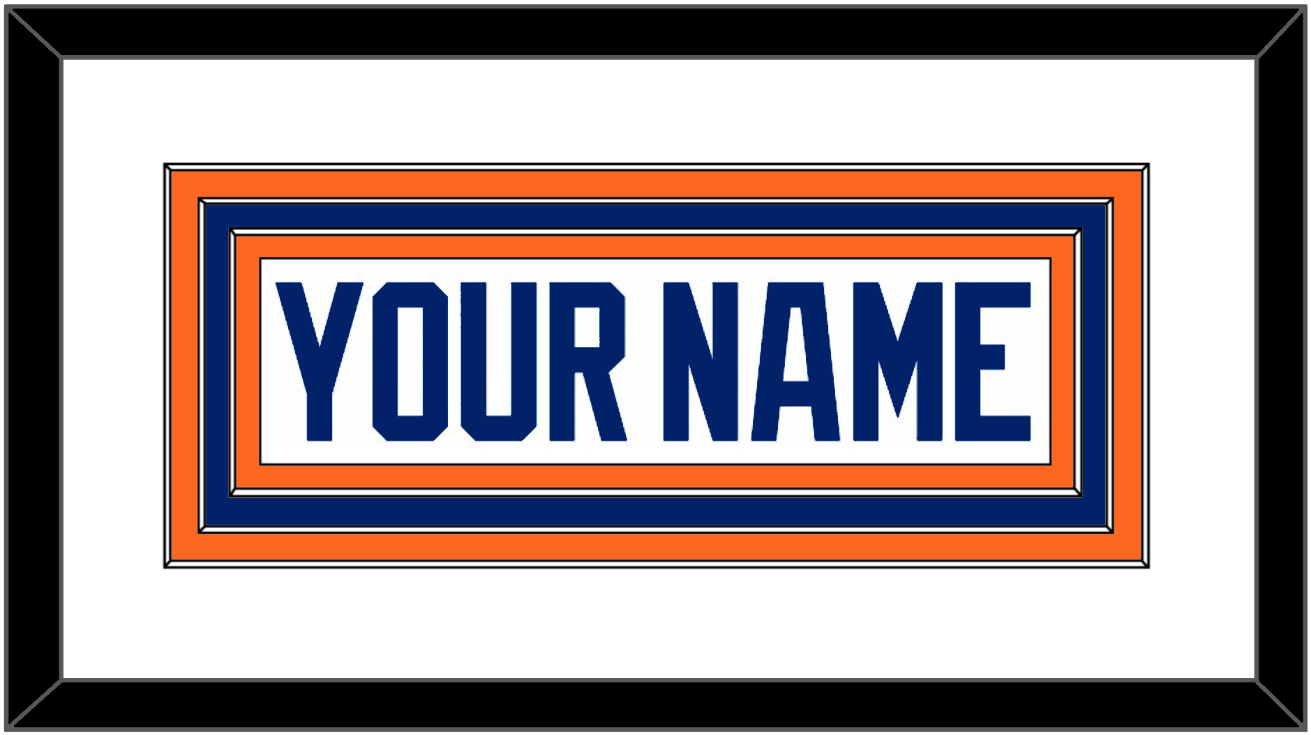 Edmonton Home White Jersey (1981 Through 1994) Nameplate. Triple Mat: White Mat Over An Orange Mat, Over A Blue Mat. White Nameplate Mounted On An Orange Mat. Black Frame.