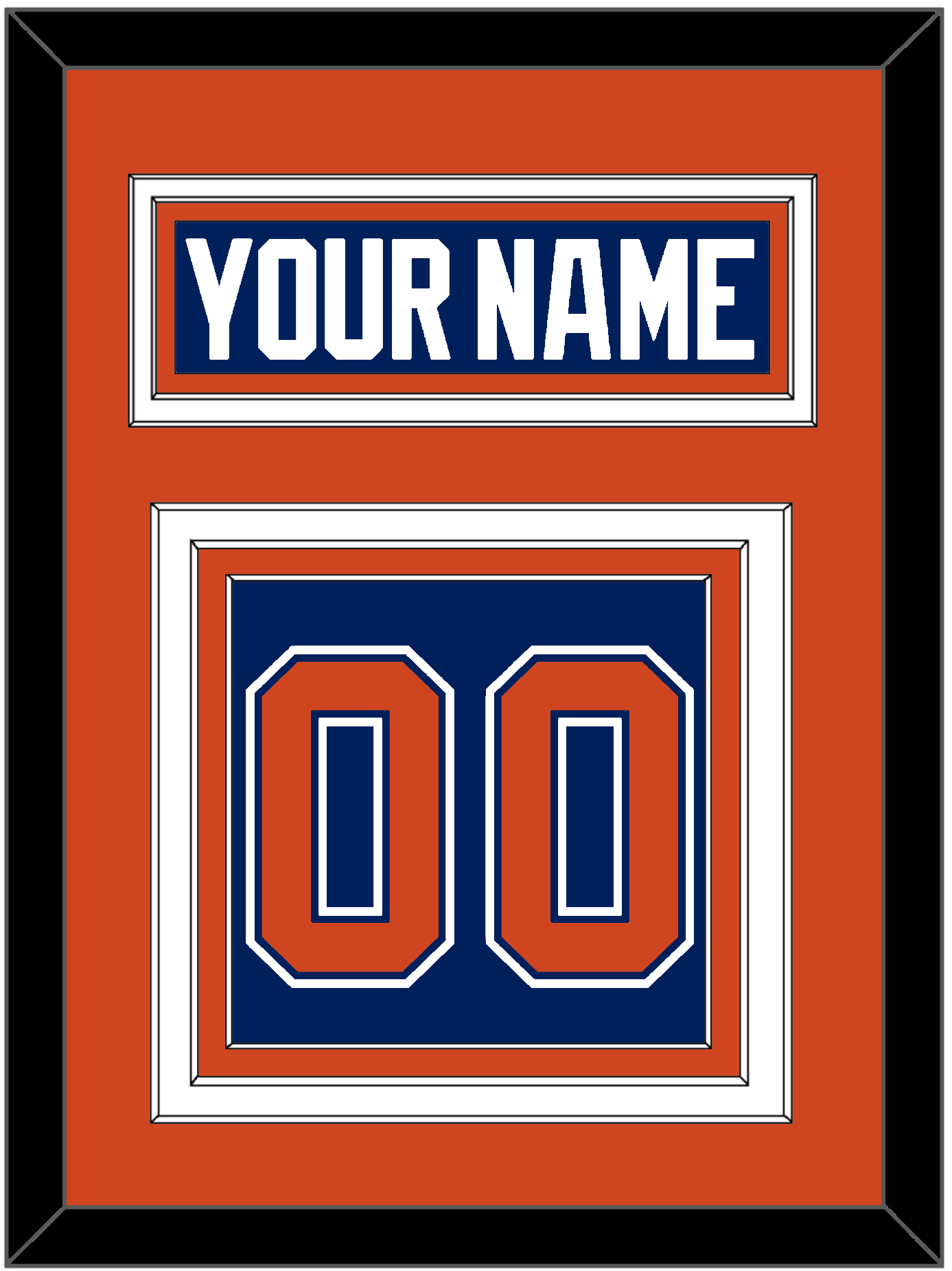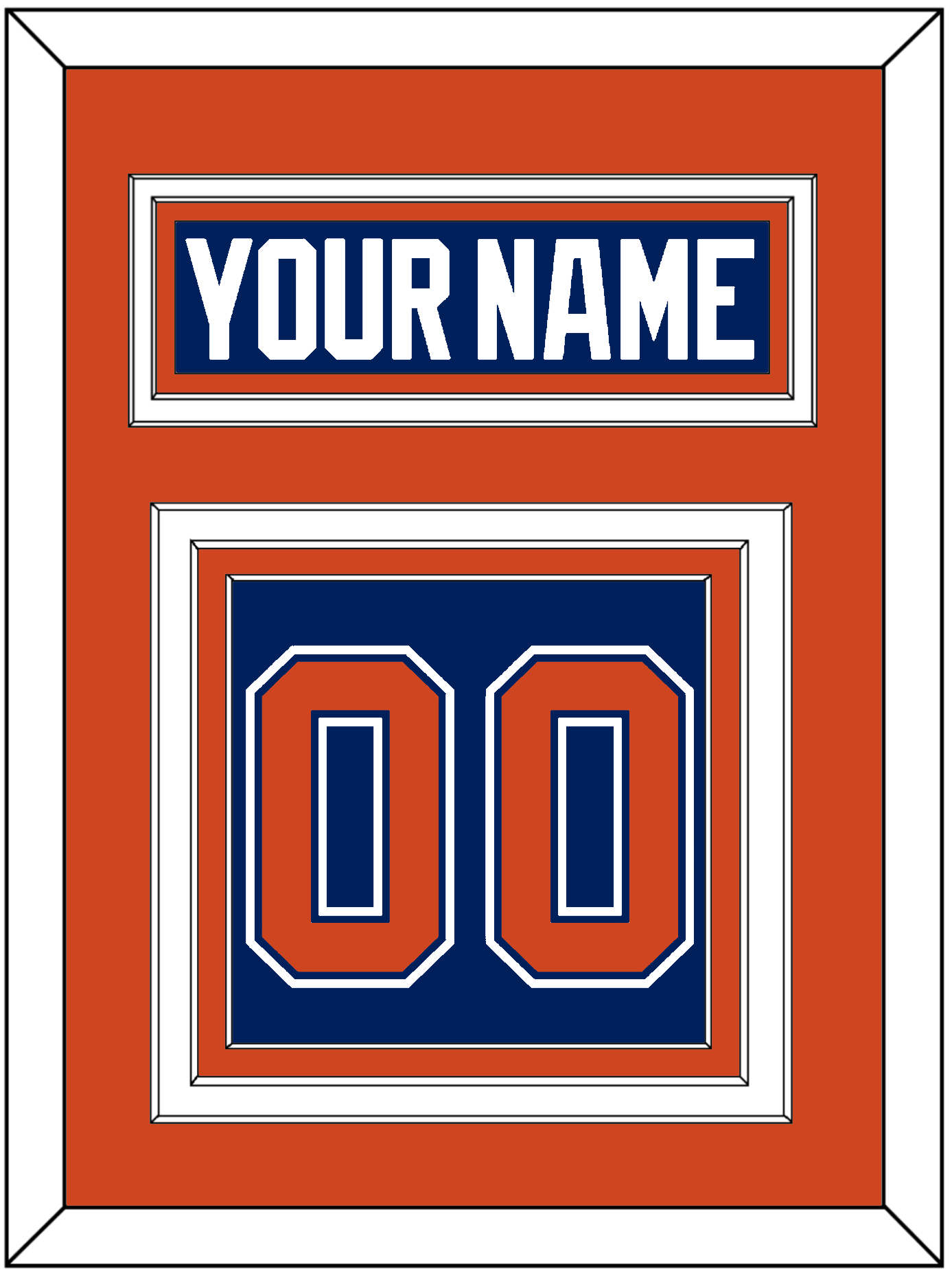 Edmonton Home Blue Jersey Nameplate & Numbers (From The Back Of The Jersey). Nameplate Is Double Mat Cut: Orange Mat Over A White Mat. Blue Nameplate Mounted On An Orange Mat. To Match The Jersey, Number Is Triple Mat Cut: Orange Mat Over A White Mat Over An Orange Mat, Orange Number Mounted On A Blue Mat. White Or Black Frame.