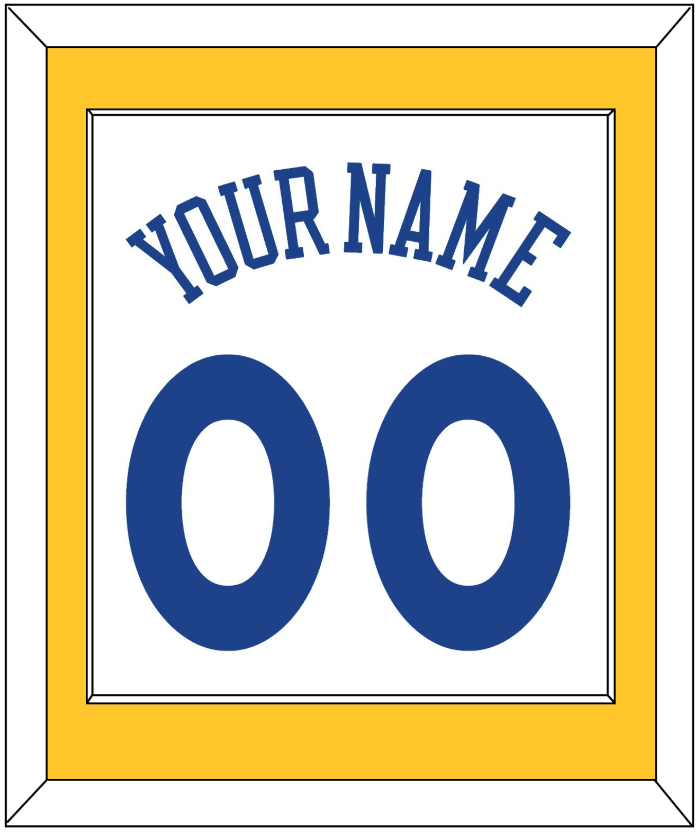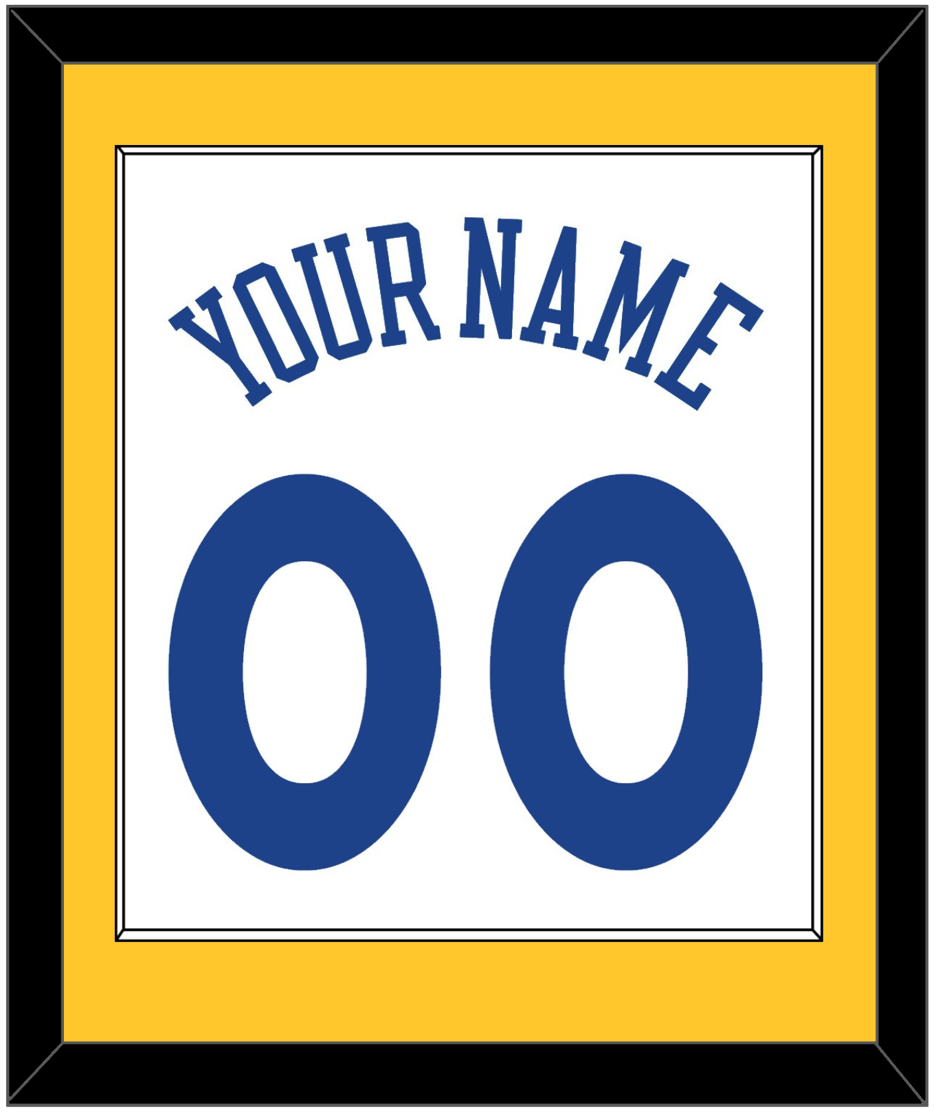 Golden State Home White Jersey (2010 Through 2019) Name & Number. Single Mat: Yellow Mat With Name And Blue Number Mounted On A White Mat. White Or Black Frame.
