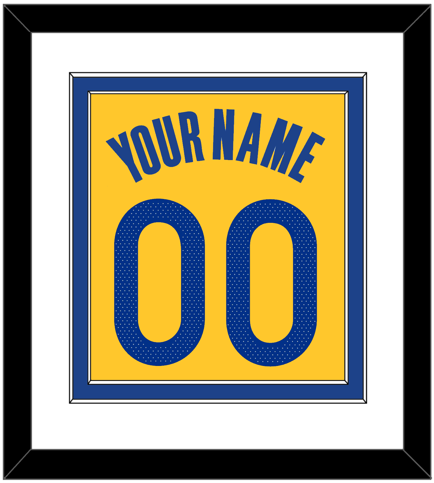 Golden State Yellow Statement Jersey (2019 Through 2022) Name & Number. Double Mat: White Mat Over A Blue Mat. Blue Name And Number Mounted On A Yellow Mat. Black Frame.