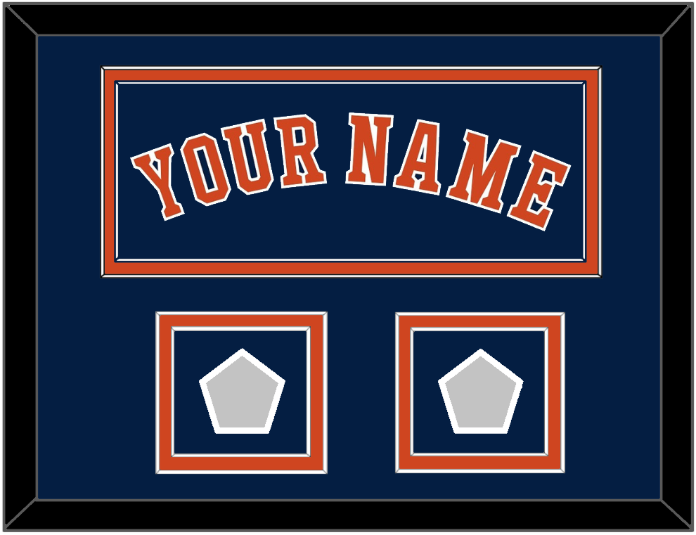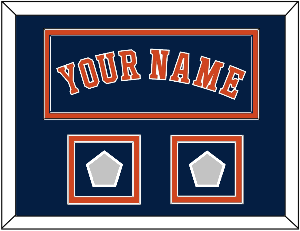 Houston Alternate Blue Jersey Name With 2017 & 2022 World Series Champions Patches. Double Mat Cut: Blue Mat Over An Orange Mat. Orange Name & Patches Mounted On A Blue Mat. White Or Black Frame.