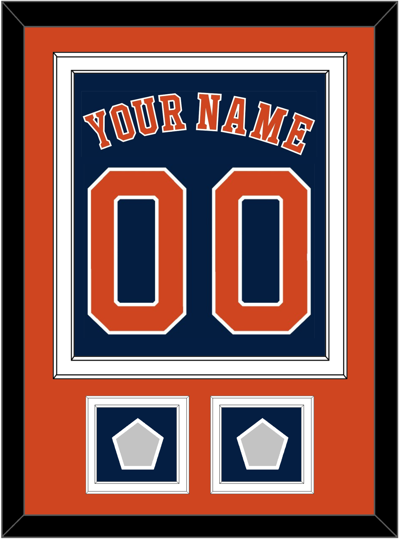 Houston Alternate Blue Jersey Name & Number With 2017 & 2022 World Series Champions Patches. Double Mat Cut: Orange Mat Over A White Mat. Orange Name, Number & Patches Mounted On A Blue Mat. White Or Black Frame.