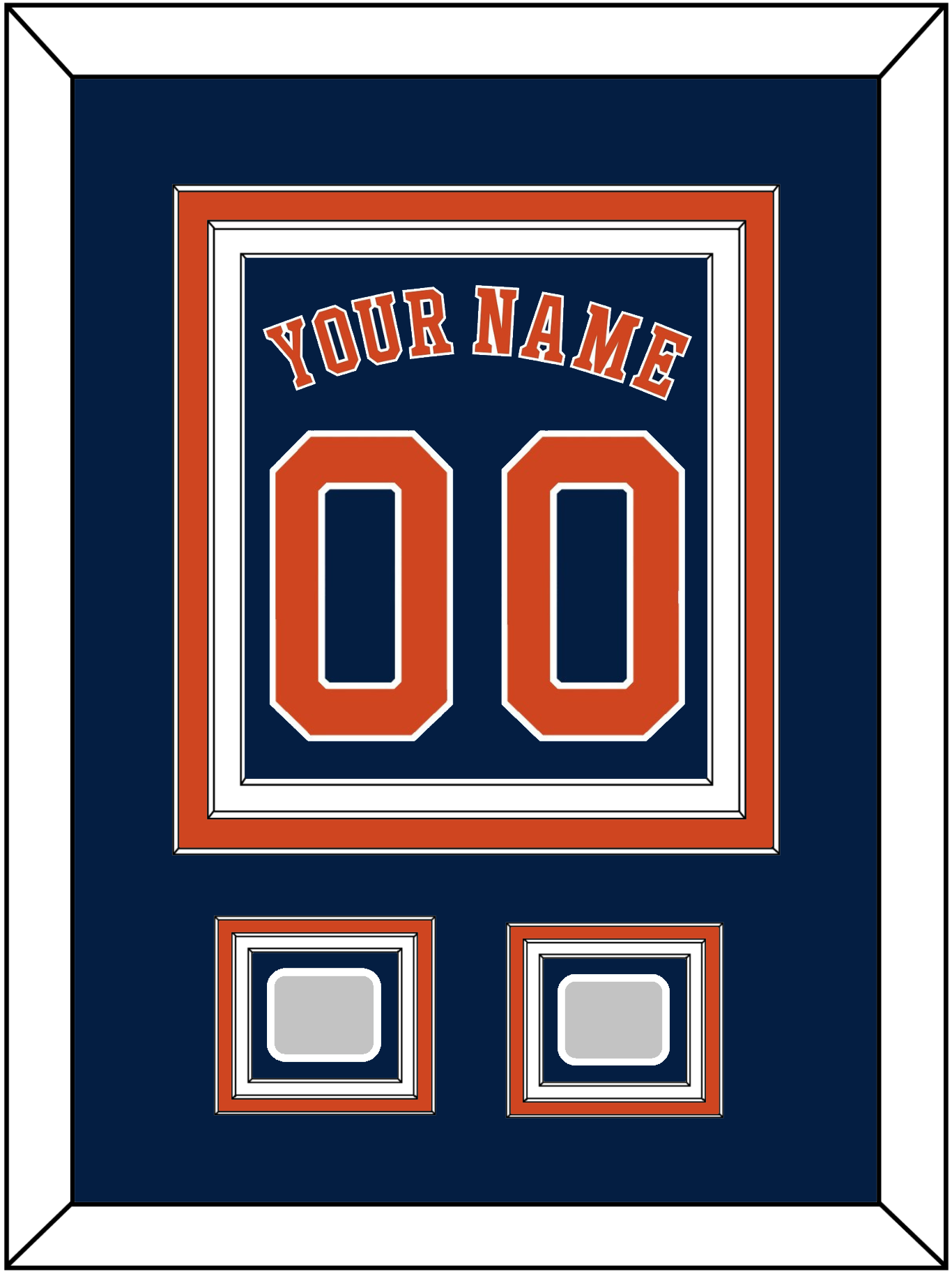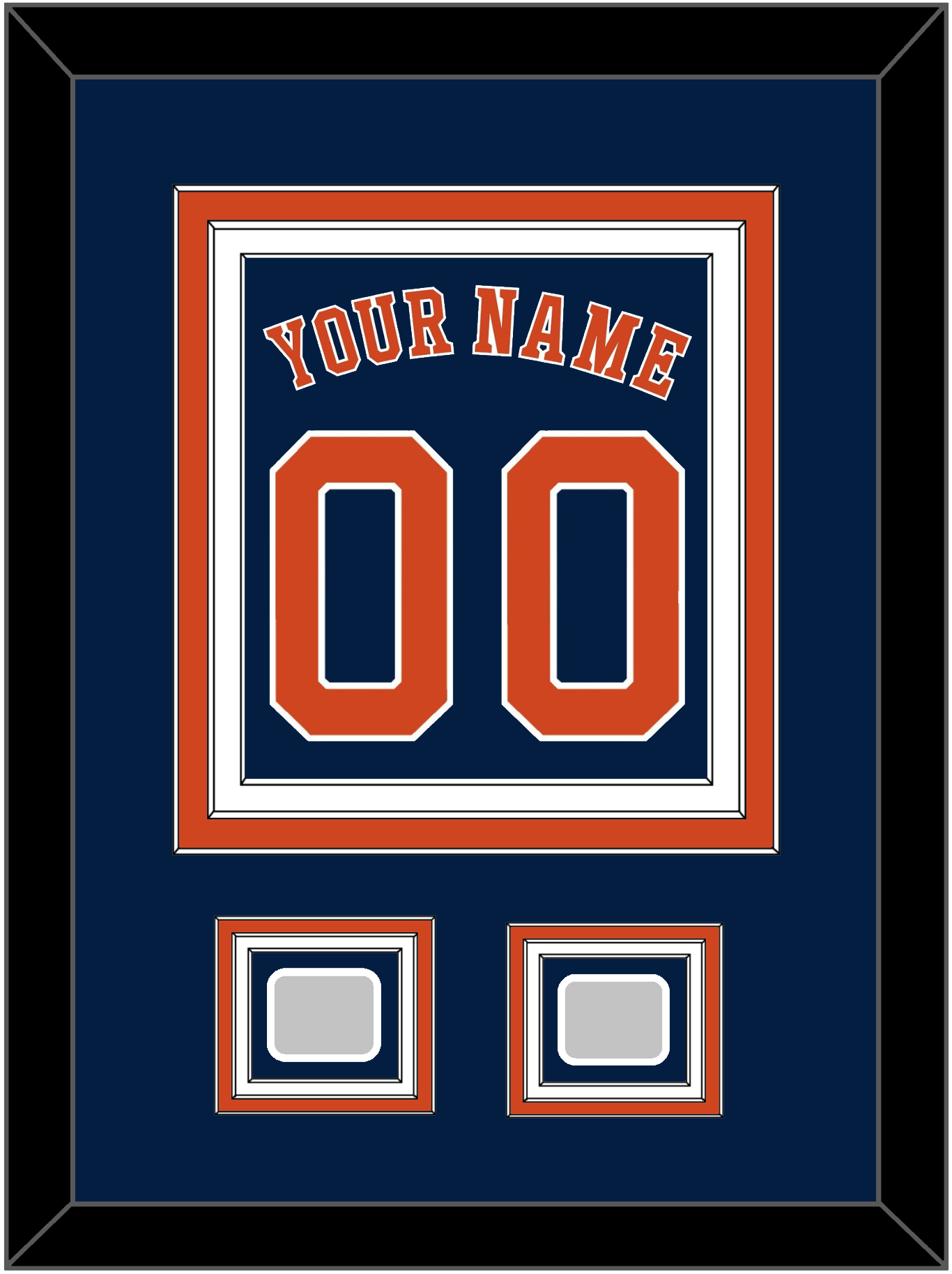 Houston Alternate Blue Jersey Name & Number With 2017 & 2022 World Series Jersey Patches. Triple Mat Cut: Blue Mat Over An Orange Mat Over A White Mat. Orange Name, Number & Patches Mounted On A Blue Mat. White Or Black Frame.