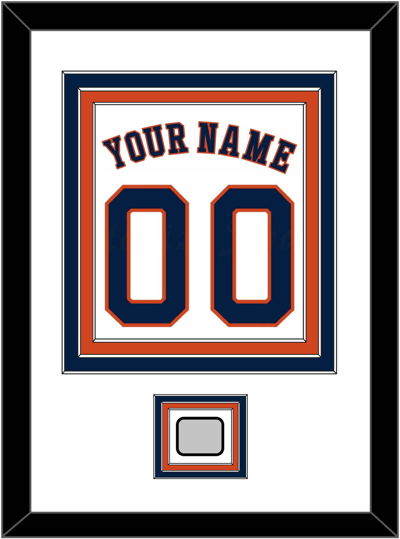 Houston Home White Jersey Name & Number With 2017 Or 2022 World Series Jersey Patch. Triple Mat Cut: White Mat Over Blue Mat, Over An Orange Mat. Blue Name, Number & Patch Mounted On A White Mat. Black Frame.
