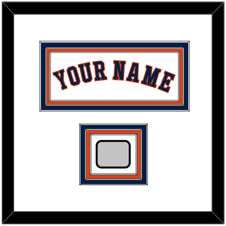 Houston Home White Jersey Name With 2017 Or 2022 World Series Champions Patch.  Triple Mat Cut:   White Mat Over A Blue Mat Over An Orange Mat.  Blue Name & Patch Mounted On A White Mat.  Black Frame.