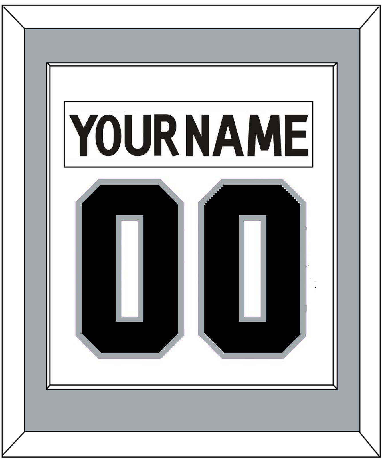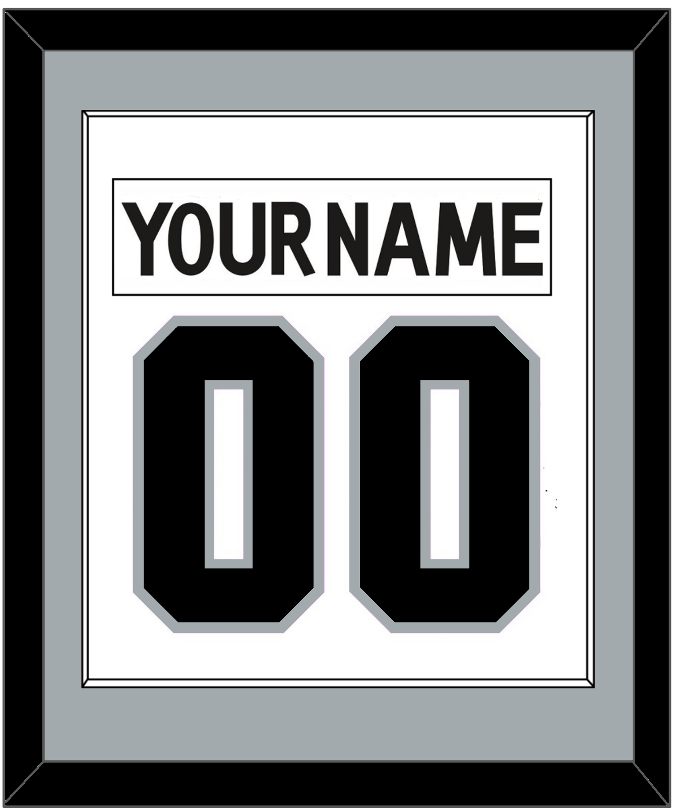 Los Angeles Road White Jersey (2017 Through 2024) Nameplate & Number (From The Back Of The Jersey). Single Mat Cut: Silver Mat With White Nameplate And Black Number Mounted On A White Mat. Black Of White Frame.