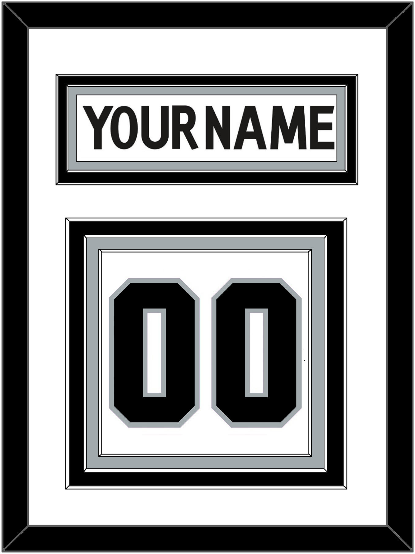 Los Angeles Road White Jersey (2017 Through 2024) Nameplate & Numbers (From The Back Of The Jersey). Nameplate Is Double Mat Cut: White Mat Over A Black Mat. White Nameplate Mounted On A Silver Mat. To Match The Jersey, Number Is Triple Mat Cut: White Mat Over A Black Mat Over A Silver Mat, Black Number Mounted On A White Mat. Black Frame.