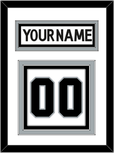 Los Angeles Road White Jersey (2017 Through 2024) Nameplate & Numbers (From The Back Of The Jersey). Nameplate Is Double Mat Cut: White Mat Over A Silver Mat. White Nameplate Mounted On A Black Mat. To Match The Jersey, Number Is Triple Mat Cut: White Mat Over A Silver Mat Over A Black Mat, Black Number Mounted On A White Mat. Black Frame.