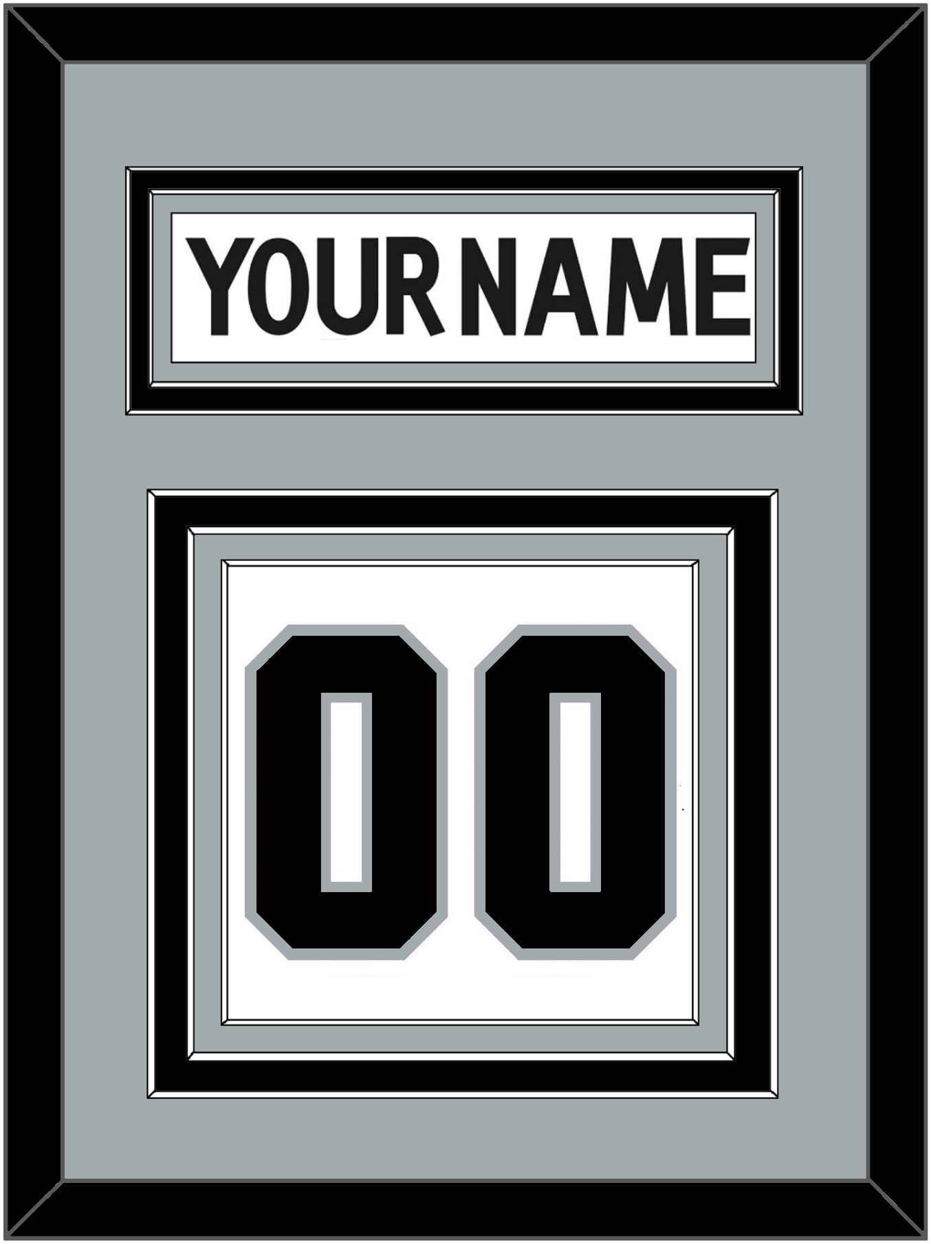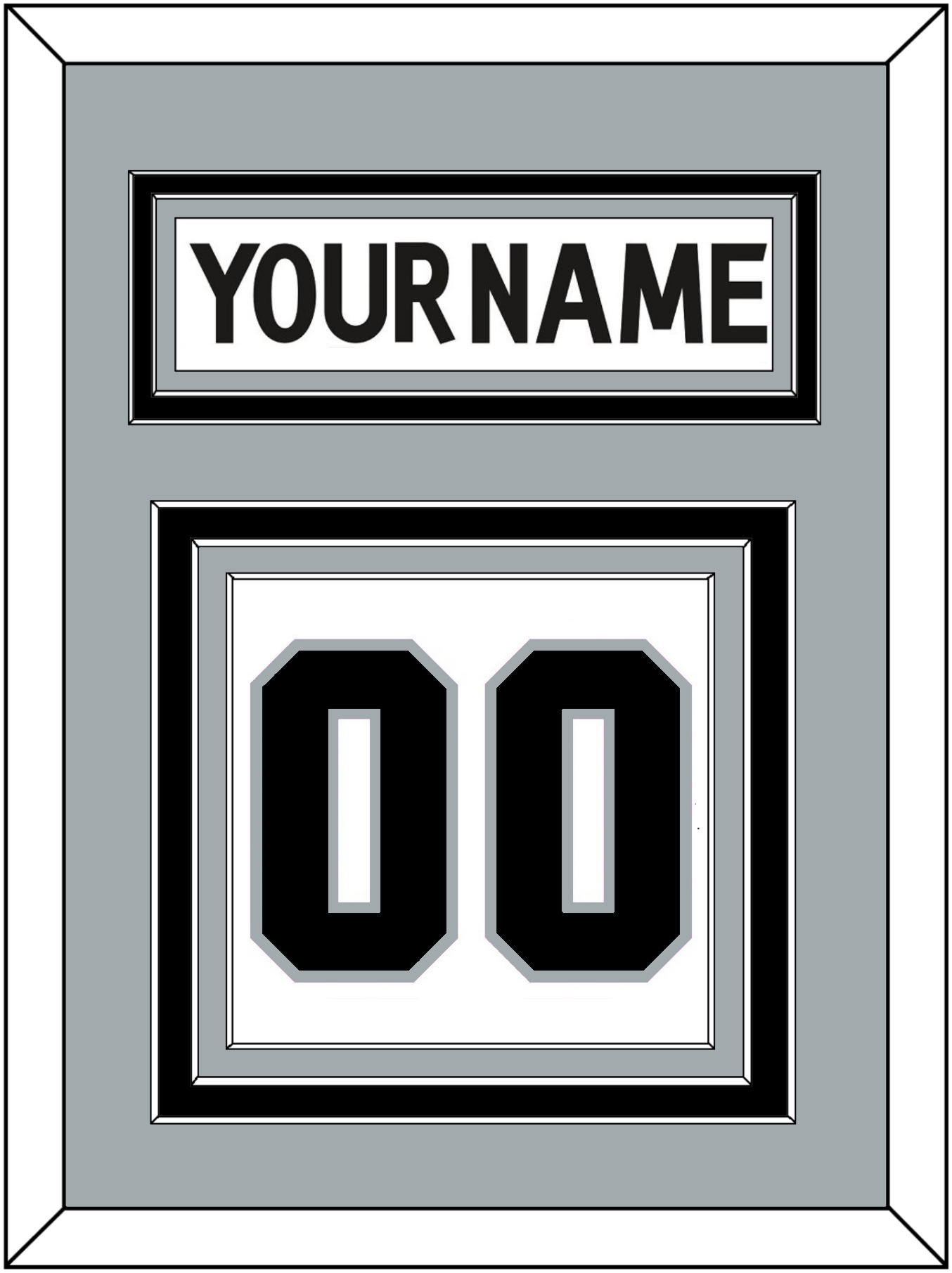 Los Angeles Road White Jersey (2017 Through 2024) Nameplate & Numbers (From The Back Of The Jersey). Nameplate Is Double Mat Cut: Silver Mat Over A Black Mat. White Nameplate Mounted On A Silver Mat. To Match The Jersey, Number Is Triple Mat Cut: Silver Mat Over A Black Mat Over A Silver Mat, Black Number Mounted On A White Mat. Black Or White Frame.
