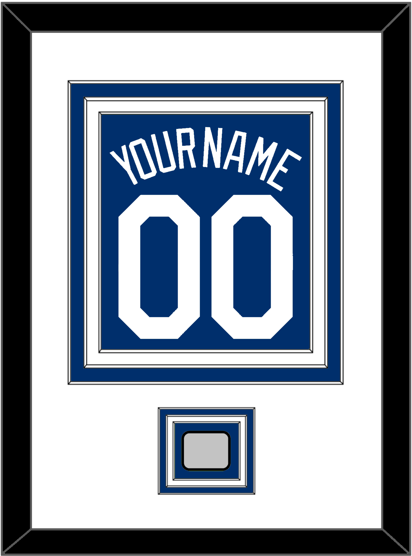 Los Angeles Alternate Road Blue Jersey Name & Number With 2020 Or 2024 World Series Champions Patch. Triple Mat Cut: White Mat Over A Blue Mat Over A White Mat. White Name, Number & Patch Mounted On A Blue Mat. Black Frame.