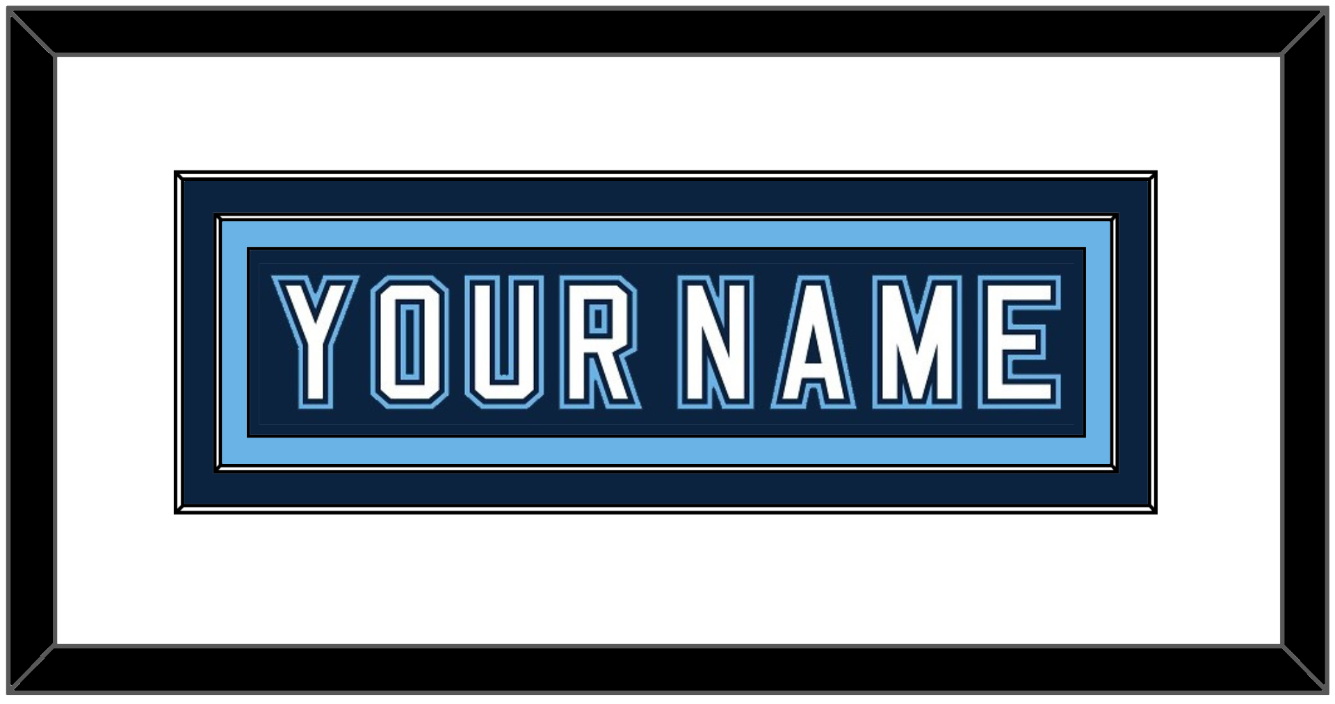 Maine Hockey Road Navy Blue Jersey Nameplate. Double Mat: White Mat Over A Navy Blue Mat. Navy Blue Nameplate Mounted On A Light Blue Mat. Black Frame.