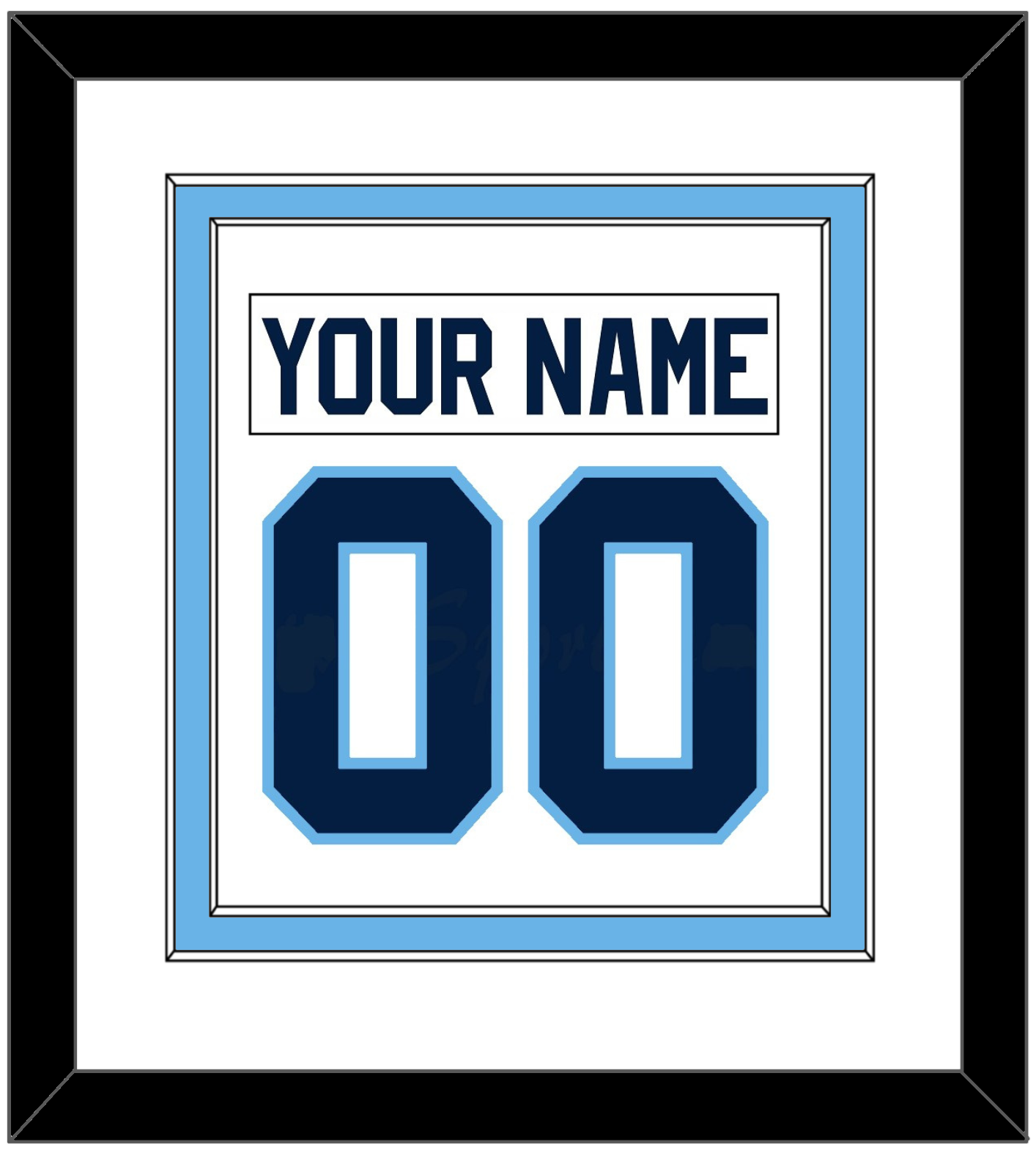 Maine Home White Jersey (1993 Through 1994) Nameplate & Number (From The Back Of The Jersey). Double Mat Cut: White Mat Over A Light Blue Mat. White Nameplate And Navy Blue Number Mounted On A White Mat. Black Frame.