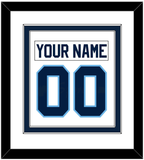 Maine Home White Jersey (1993 Through 1994) Nameplate & Number (From The Back Of The Jersey). Double Mat Cut: White Mat Over A Navy Blue Mat. White Nameplate And Navy Blue Number Mounted On A White Mat. Black Frame.