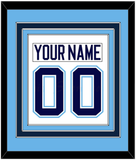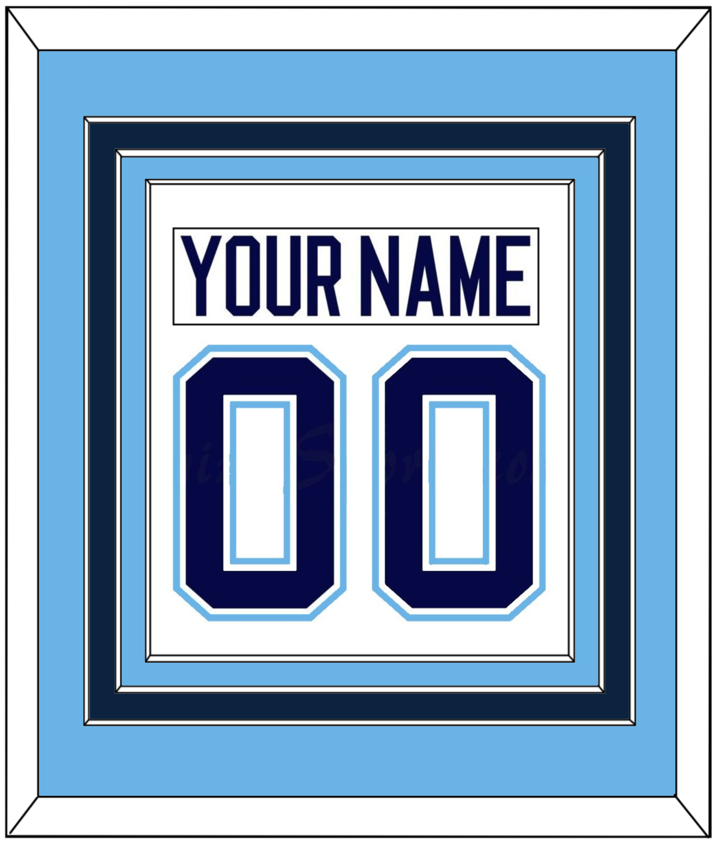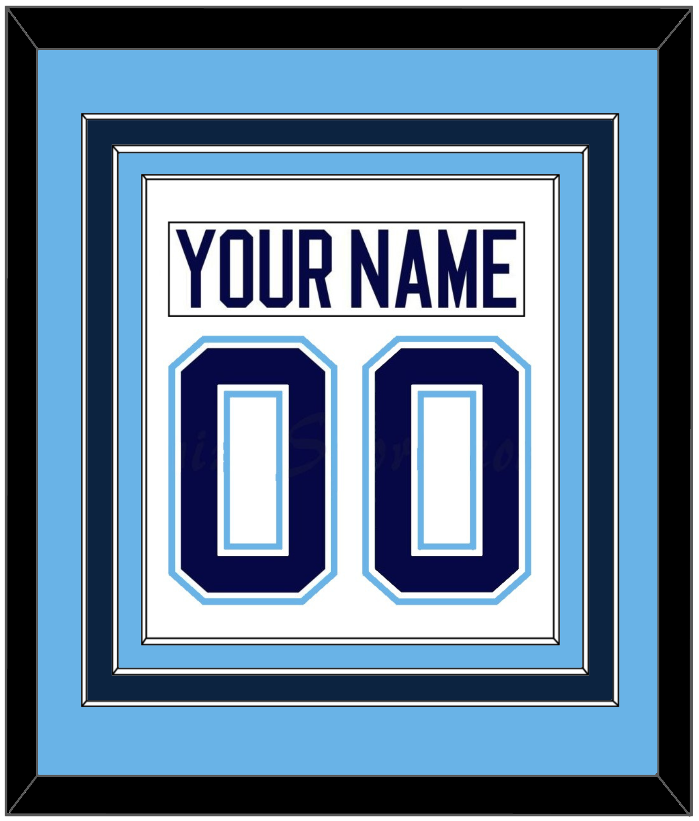 Maine Home White Jersey (1994 Through 2008) Nameplate & Number (From The Back Of The Jersey). Triple Mat Cut: Light Blue Mat Over A Navy Blue Mat Over A Light Blue Mat. White Nameplate And Navy Blue Number Mounted On A White Mat. White Or Black Frame.