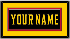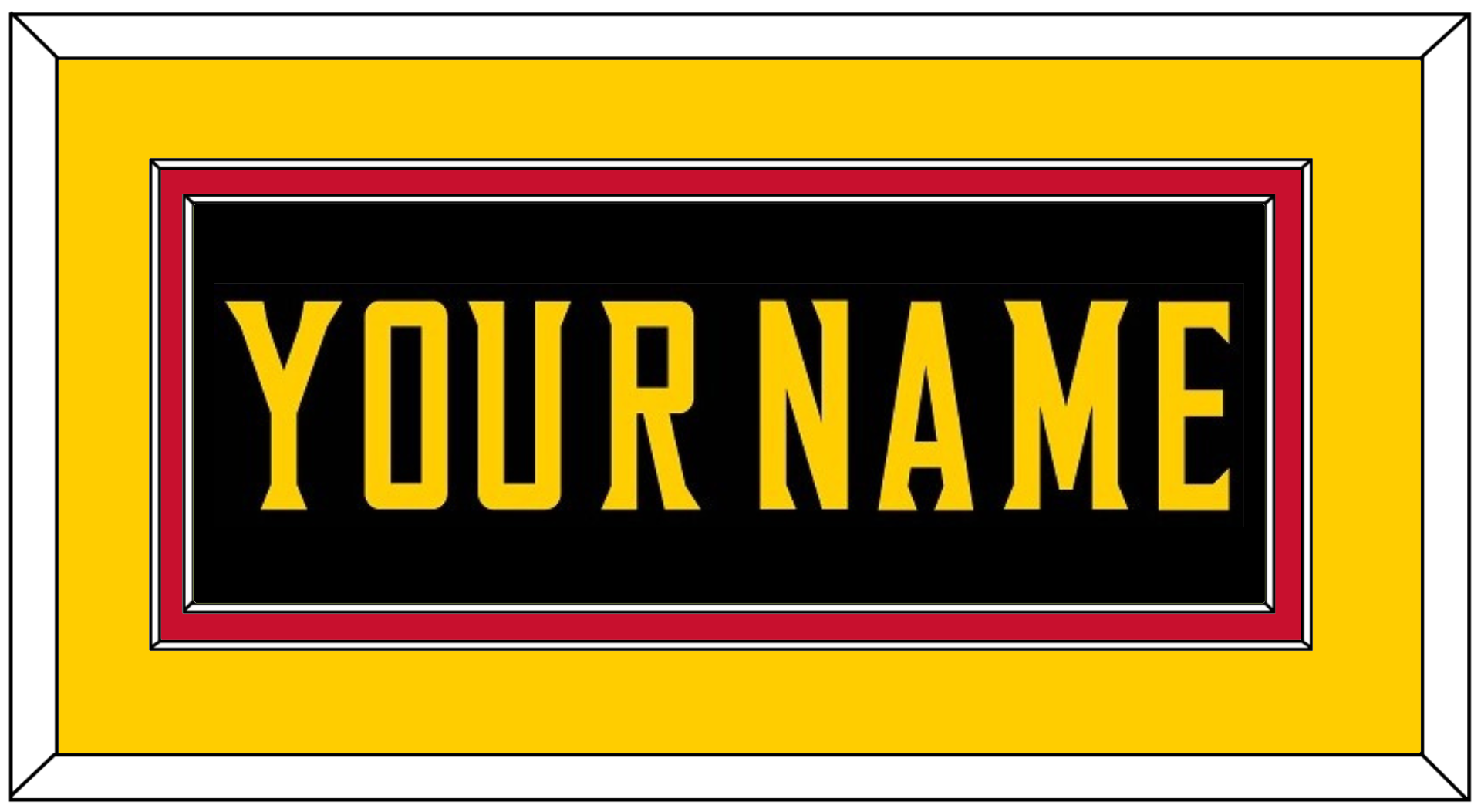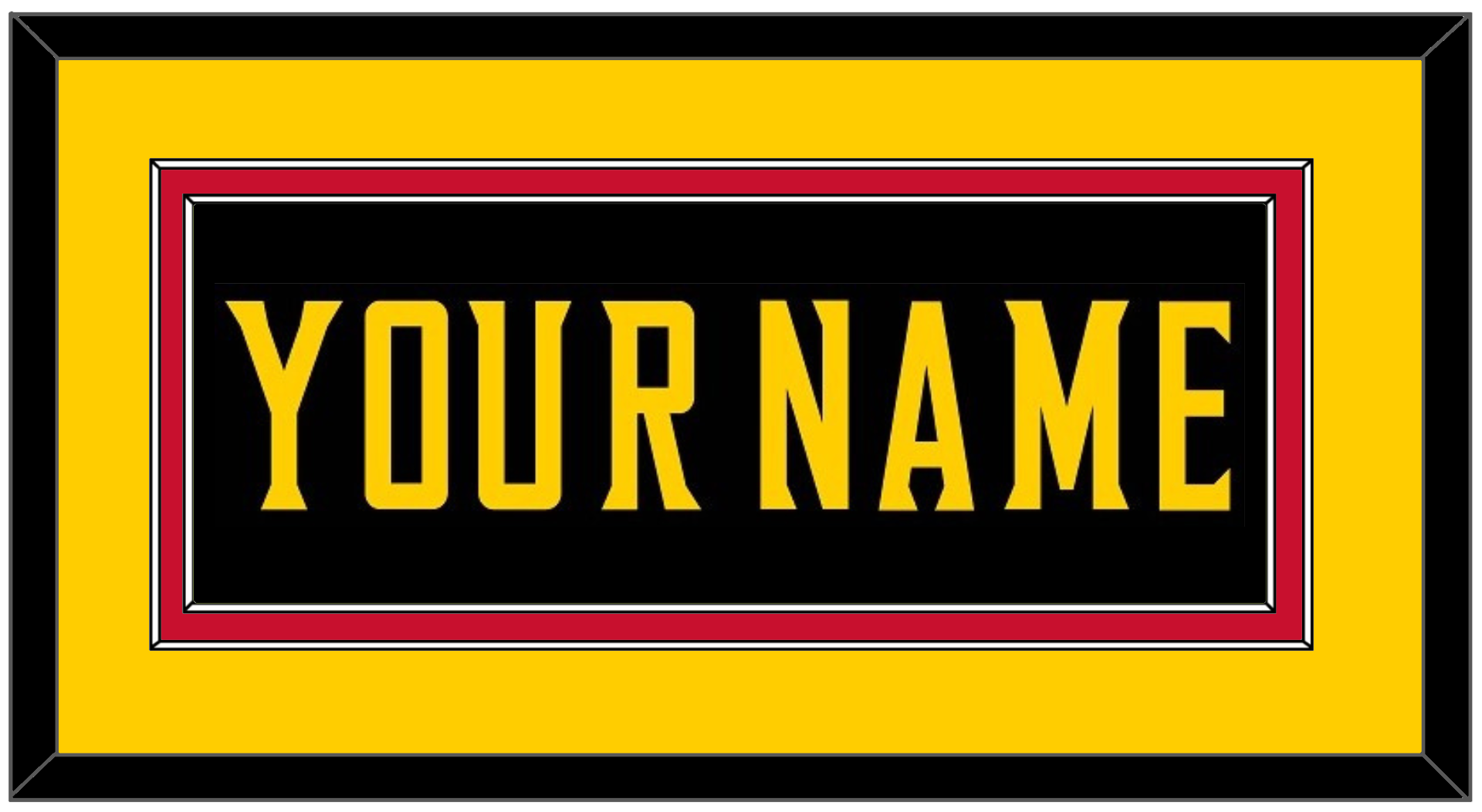Maryland Basketball Road Black Jersey (2013 Through 2015) Name.  Double Mat:  Gold Mat Over A Red Mat.  Gold Name Mounted On A Black Mat.  Black Or White Frame.
