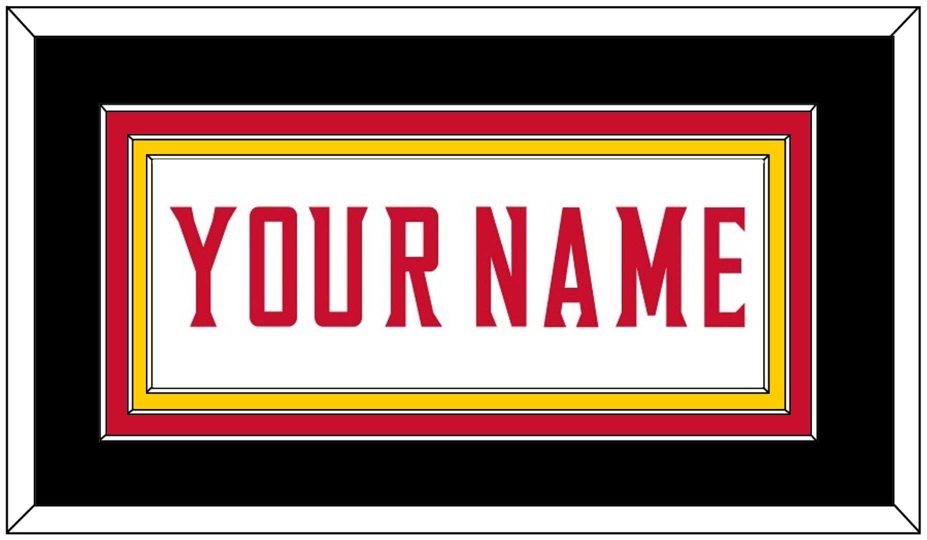 Maryland Basketball Home White Jersey (2013 Through 2015) Name.  Triple Mat:  Black Mat Over A Red Mat Over A Gold Mat.  Red Name Mounted On A White Mat.  White Frame.