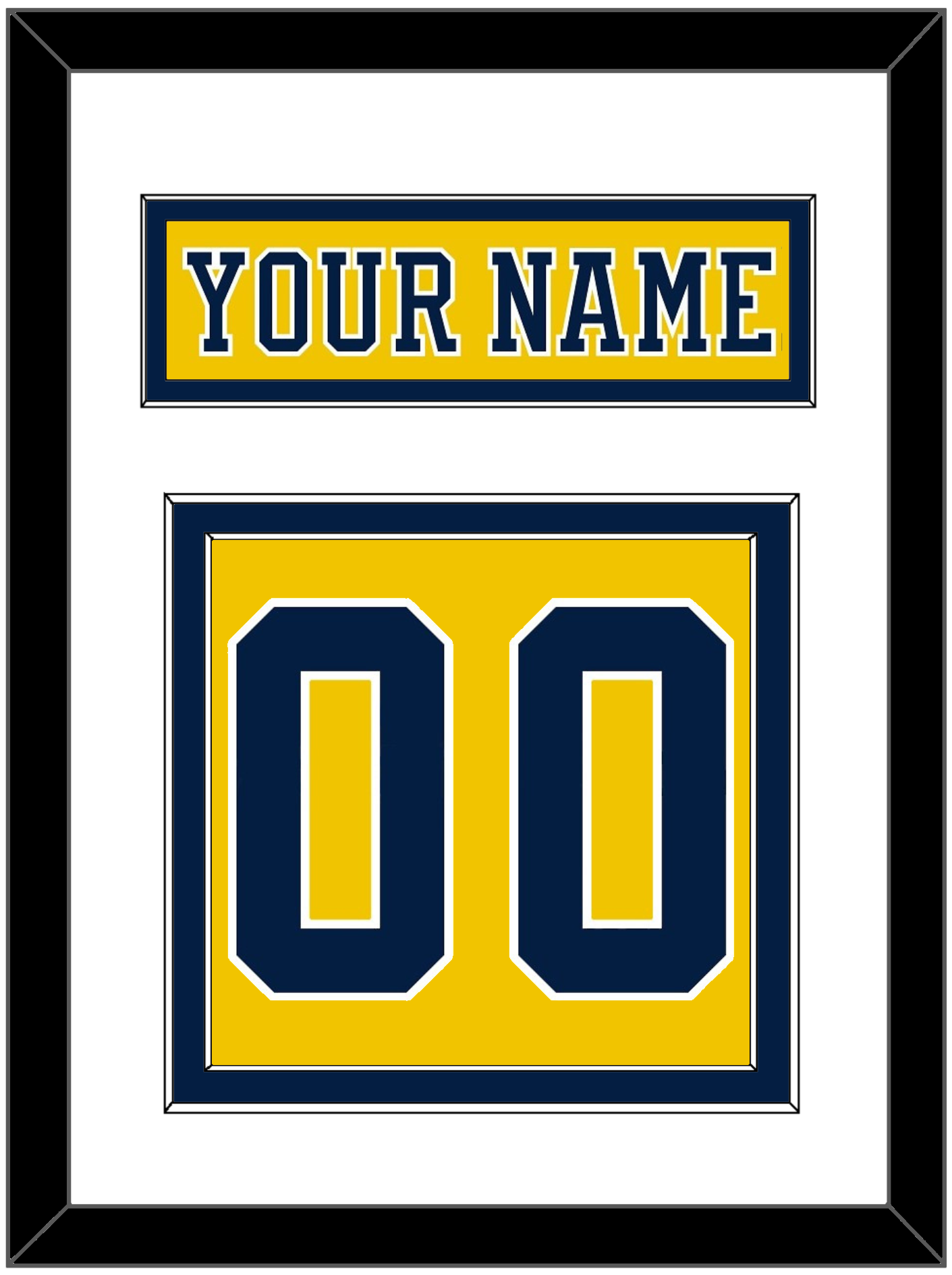 Michigan Alternate Maize Jersey (2019 Through 2020) Nameplate & Numbers (From The Back Of The Jersey). Nameplate Is Single Mat Cut: White Mat With Maize Nameplate Mounted On A Blue Mat. To Match The Jersey, Number Is Double Mat Cut: White Mat Over A Blue Mat, Blue Number Mounted On A Maize Mat. Black Frame.
