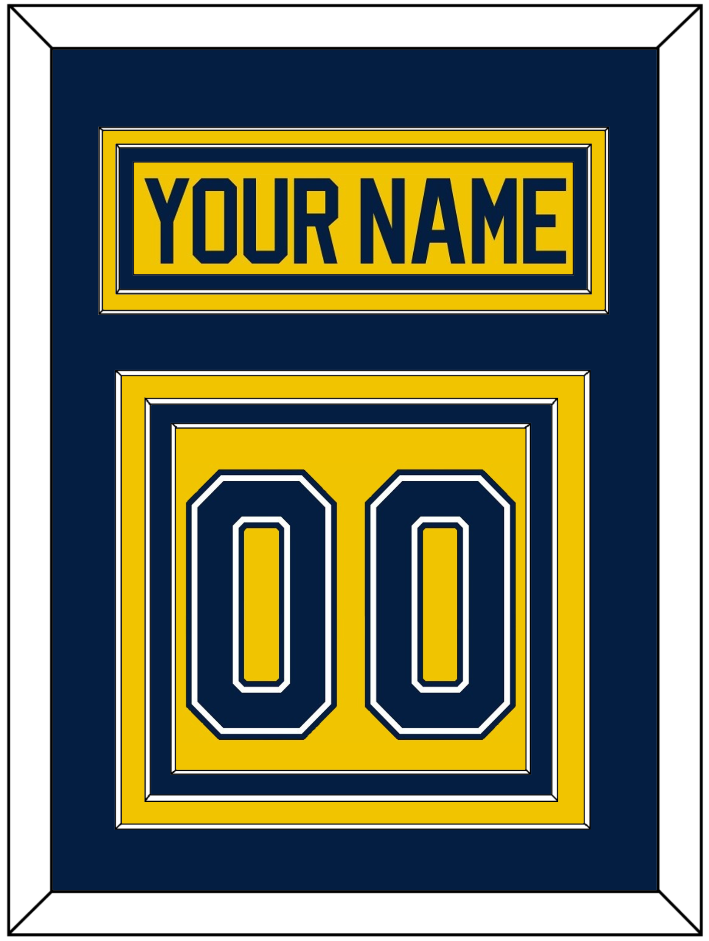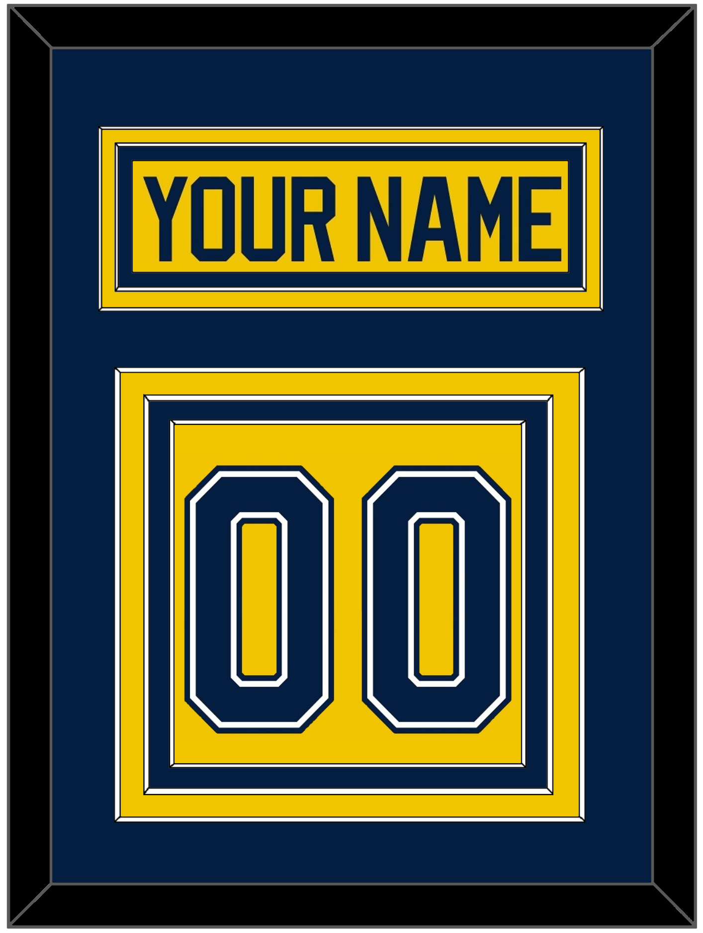 Michigan Alternate Maize Jersey (2021 Through 2023) Nameplate & Numbers (From The Back Of The Jersey). Nameplate Is Double Mat Cut: Blue Mat Over A Maize Mat. Maize Nameplate Mounted On A Blue Mat. To Match The Jersey, Number Is Triple Mat Cut: Blue Mat Over A Maize Mat Over A Blue Mat, Blue Number Mounted On A Maize Mat. White Or Black Frame.