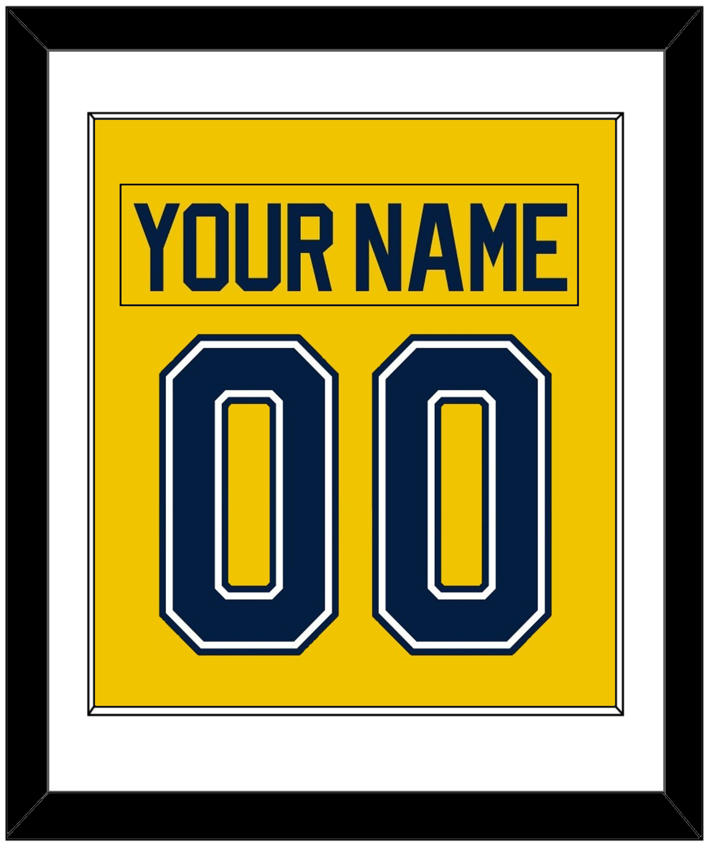 Michigan Alternate Maize Jersey (2021 Through 2023) Nameplate & Number (From The Back Of The Jersey). Single Mat Cut: White Mat With Maize Nameplate And Blue Number Mounted On A Maize Mat. Black Frame.