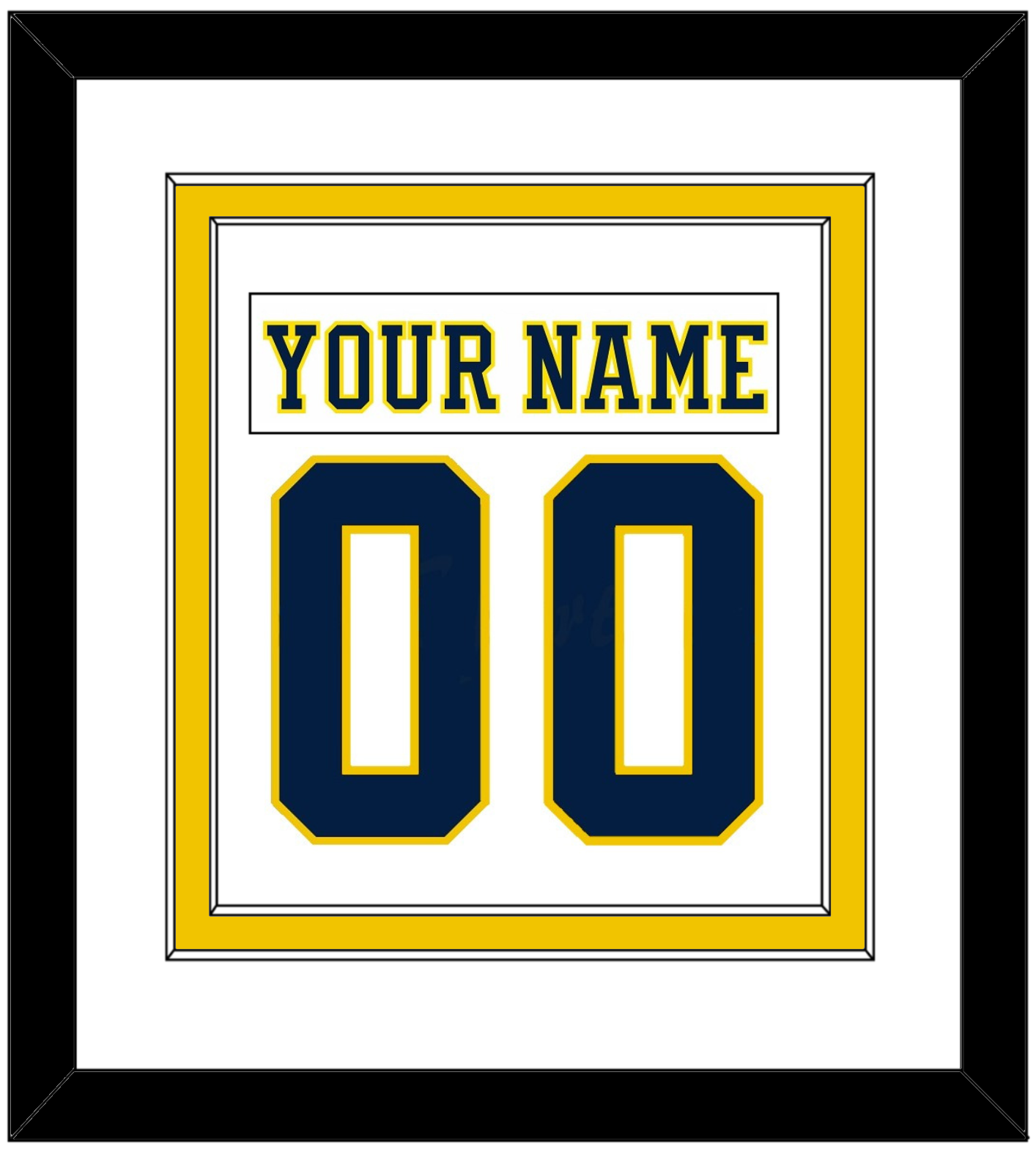 Michigan Home White Jersey (2019 Through 2020) Nameplate & Number (From The Back Of The Jersey). Double Mat Cut: White Mat Over A Maize Mat. White Nameplate And Blue Number Mounted On A White Mat. Black Frame.