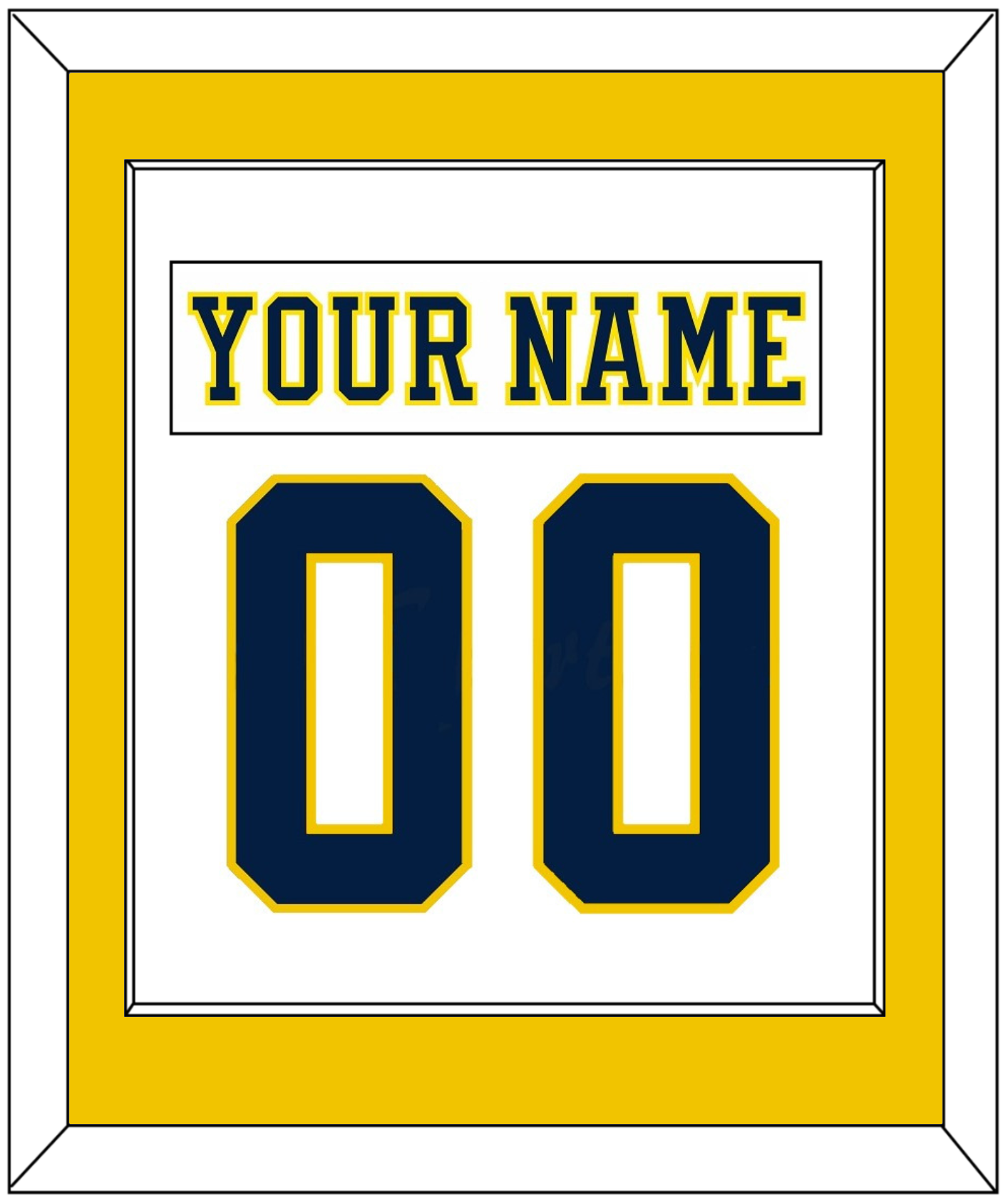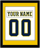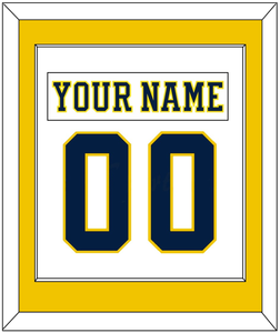 Michigan Home White Jersey (2019 Through 2020) Nameplate & Number (From The Back Of The Jersey). Single Mat Cut: Maize Mat With White Nameplate And Blue Number Mounted On A White Mat. White Or Black Frame.