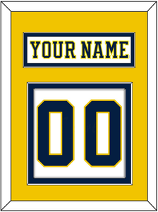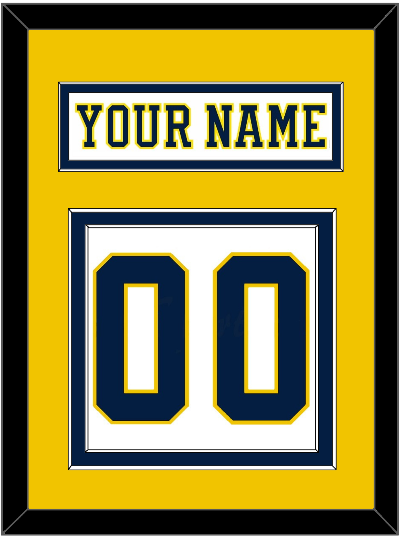 Michigan Home White Jersey (2019 Through 2020) Nameplate & Numbers (From The Back Of The Jersey). Nameplate Is Single Mat Cut: Maize Mat With White Nameplate Mounted On A Blue Mat. To Match The Jersey, Number Is Double Mat Cut: Blue Mat Over A Blue Mat, Blue Number Mounted On A White Mat. White Or Black Frame.