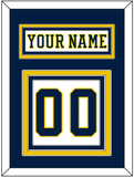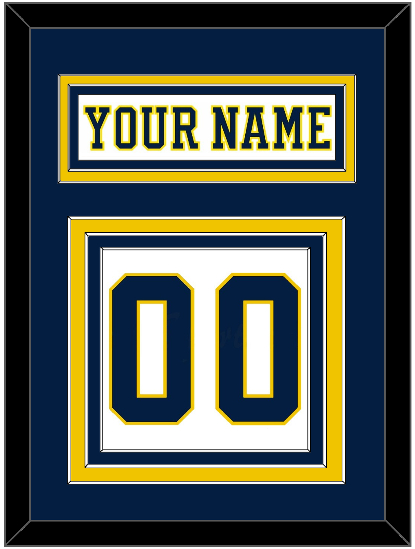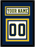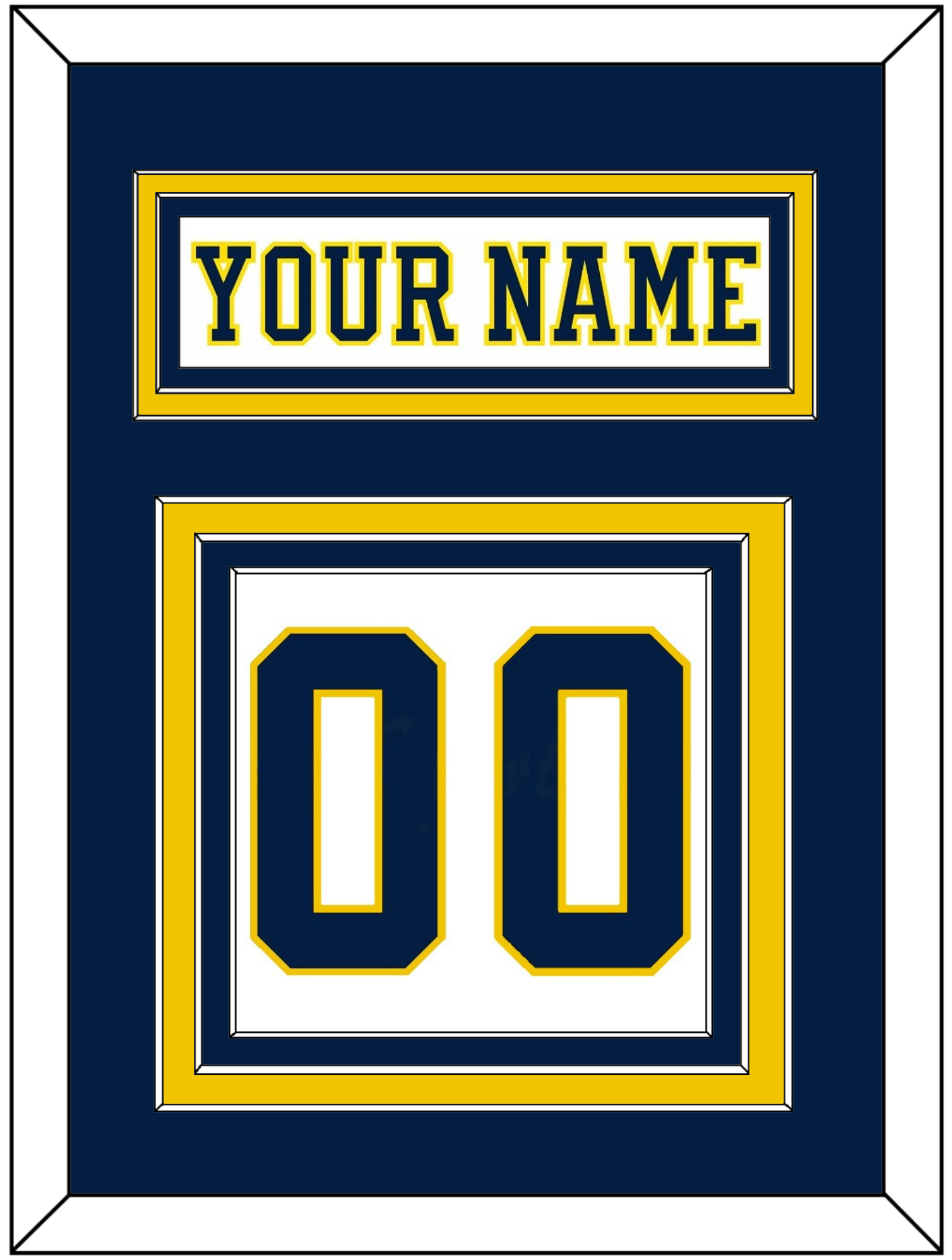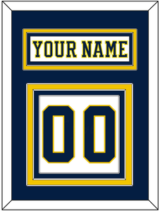 Michigan Home White Jersey (2019 Through 2020) Nameplate & Numbers (From The Back Of The Jersey). Nameplate Is Double Mat Cut: Blue Mat Over A Maize Mat. White Nameplate Mounted On A Blue Mat. To Match The Jersey, Number Is Triple Mat Cut: Blue Mat Over A Maize Mat Over A Blue Mat. Blue Number Mounted On A White Mat. White Or Black Frame.