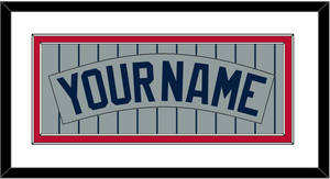 Minnesota Road Gray Pinstripes Jersey (1987 Through 2009) Nameplate. Double Mat: White Mat Over A Red Mat. Gray Nameplate Mounted On Pinstripes. Black Frame.