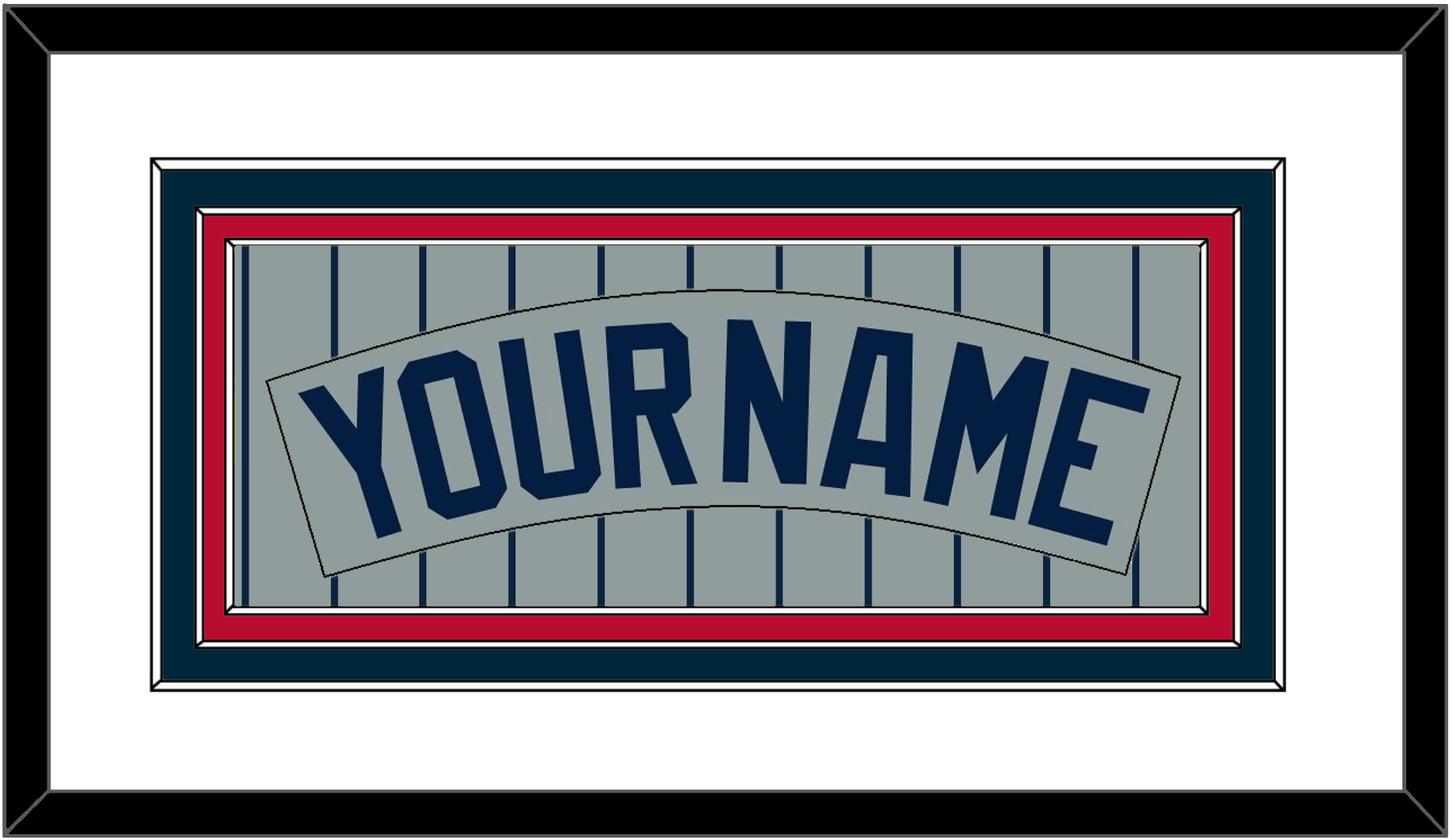 Minnesota Road Gray Pinstripes Jersey (1987 Through 2009) Nameplate. Triple Mat: White Mat Over A Blue Mat Over A Red Mat. Gray Nameplate Mounted On Pinstripes. Black Frame.