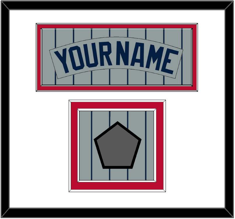 Minnesota Road Gray Pinstripes Jersey (1987 Through 2009) Nameplate & 1987 World Series Champions Patch. Double Mat: White Mat Over A Red Mat. Gray Nameplate & Patch Mounted On Pinstripes. Black Frame.