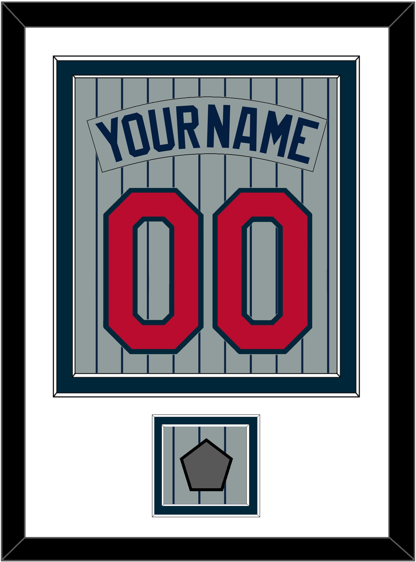 Minnesota Road Gray Pinstripes Jersey (1987 Through 2009) Name, Number & 1987 World Series Champions Patch. Double Mat Cut: White Mat Over A Blue Mat. Gray Nameplate, Red Number & Patch Mounted On Pinstripes. Black Frame.