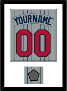 Minnesota Road Gray Pinstripes Jersey (1987 Through 2009) Name, Number & 1987 World Series Champions Patch. White Mat With Gray Nameplate, Red Number & Patch Mounted On Pinstripes. Black Frame.
