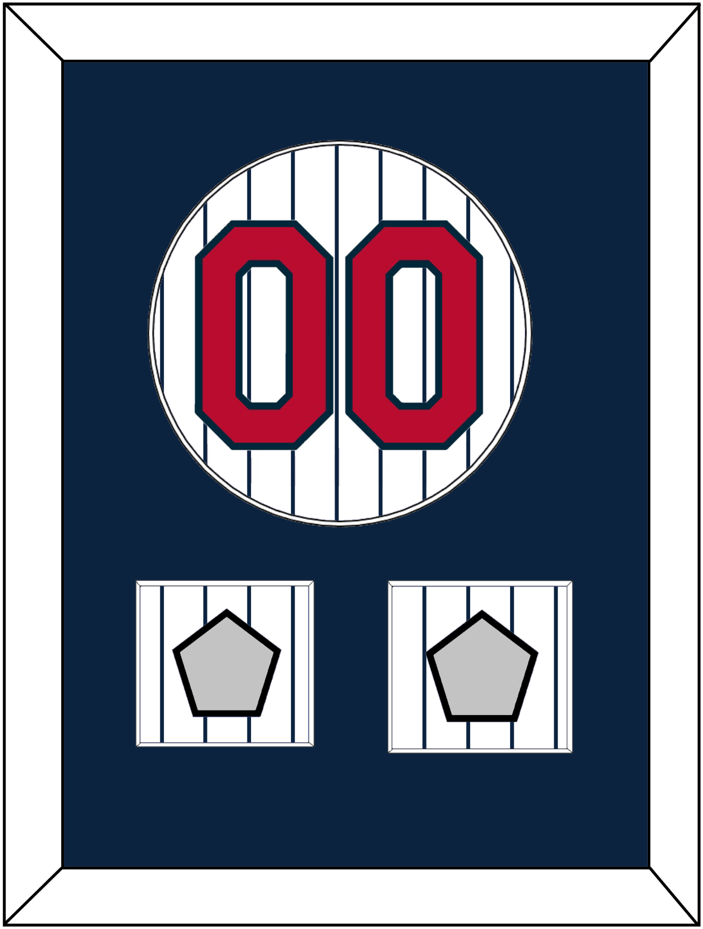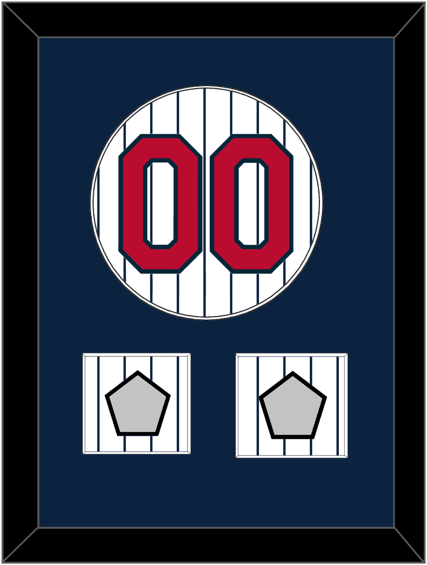 Minnesota Home White Pinstripes (1987 Through 2009) Jersey Number With 1987 & 1991 World Series Patches. Single Mat Cut: Blue Mat With Red Numbers & Patches Mounted On A White Pinstripe Mat. White Or Black Frame.