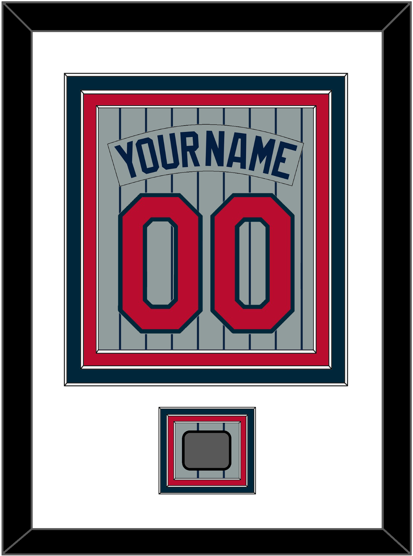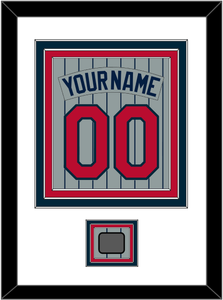 Minnesota Road Gray Pinstripes Jersey (1987 Through 2009) Name & Number With 1987 Or 1991 World Series Patch. Triple Mat Cut: White Mat Over A Blue Mat Over A Red Mat. Gray Nameplate, Red Number & Patch Mounted On Pinstripes. Black Frame.