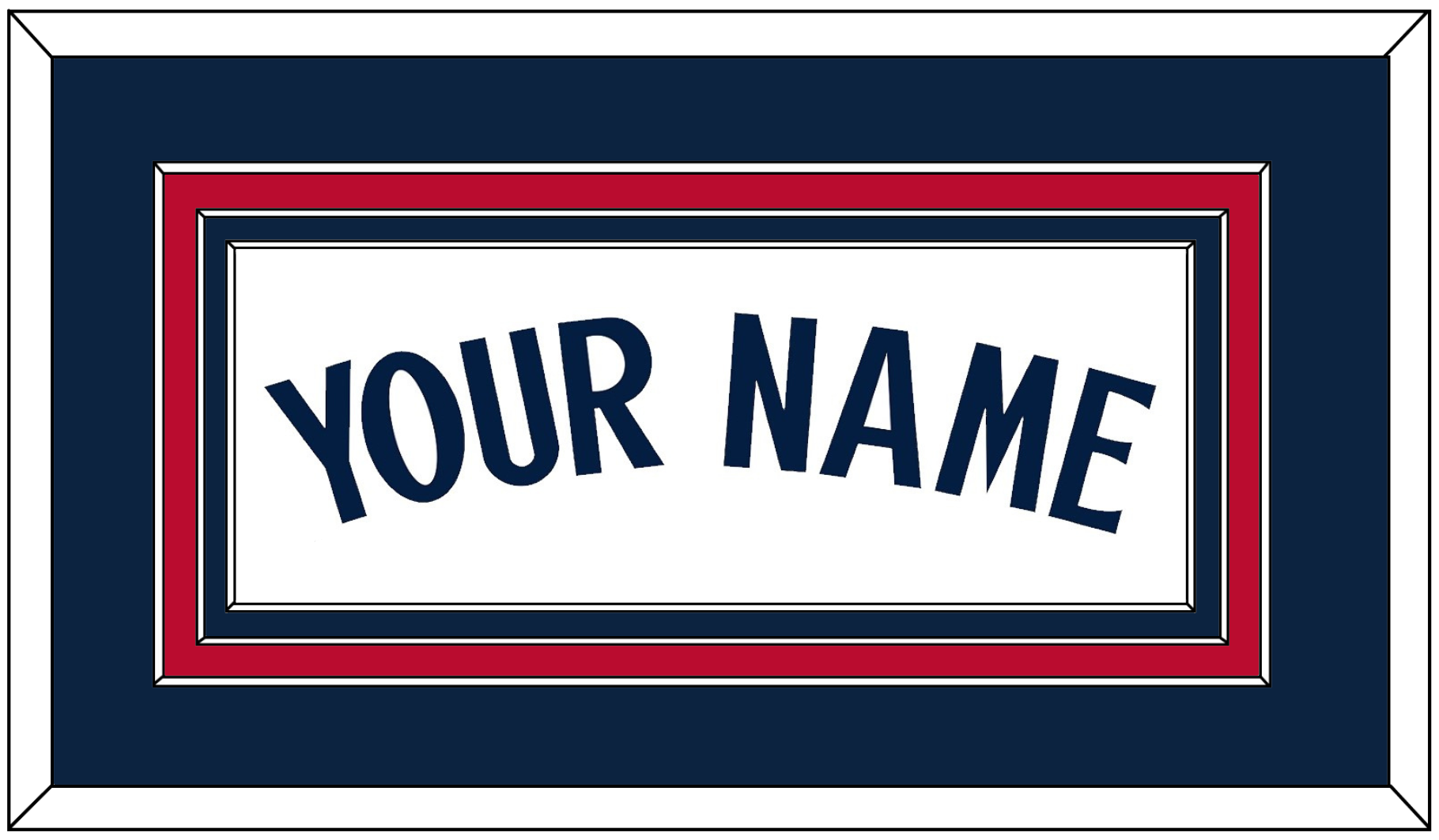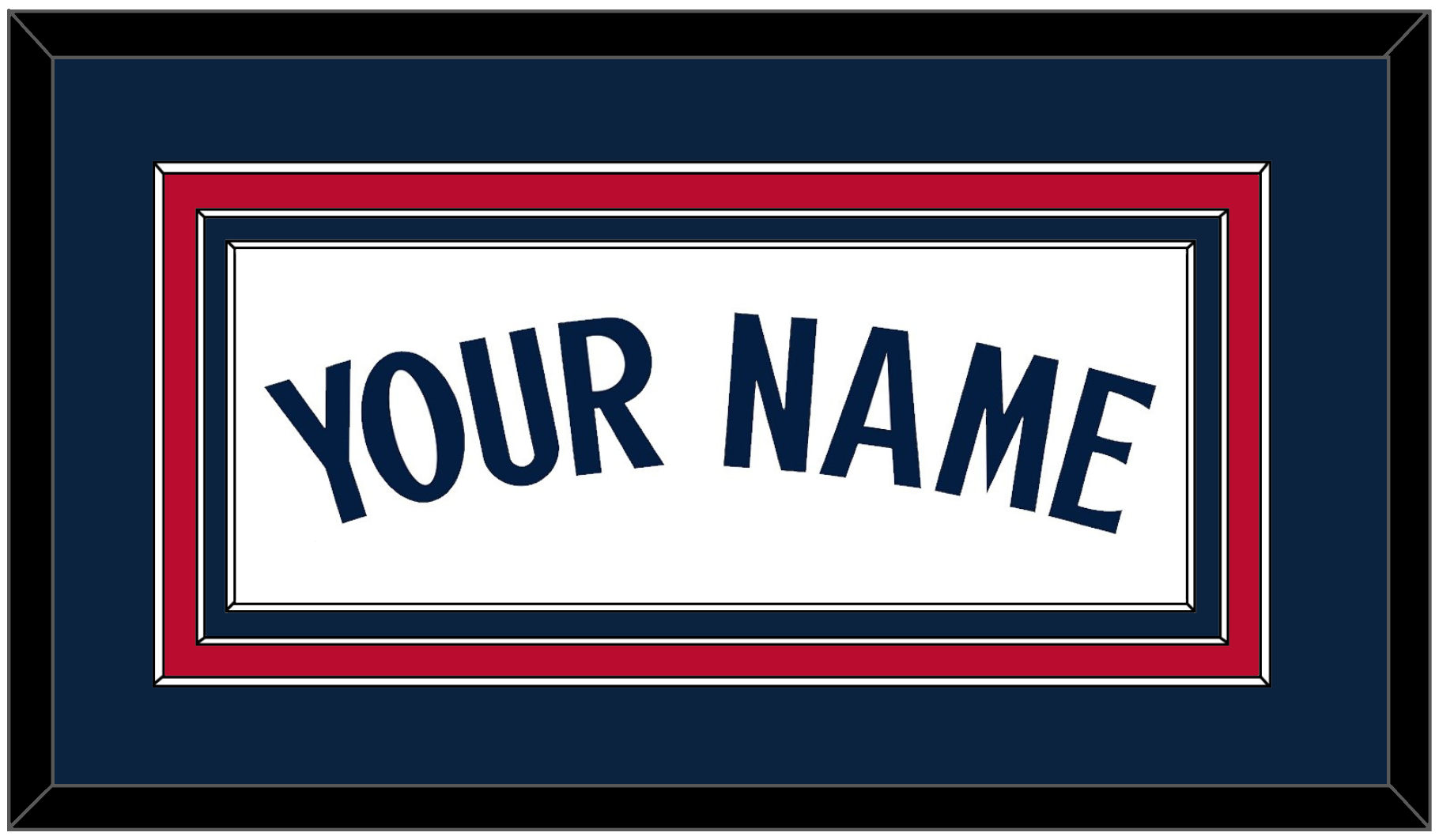 Minnesota Home White Jersey Name. Triple Mat: Navy Blue Mat Over A Red Mat Over A Navy Blue Mat. Navy Blue Name Mounted On White Mat. White Or Black Frame.