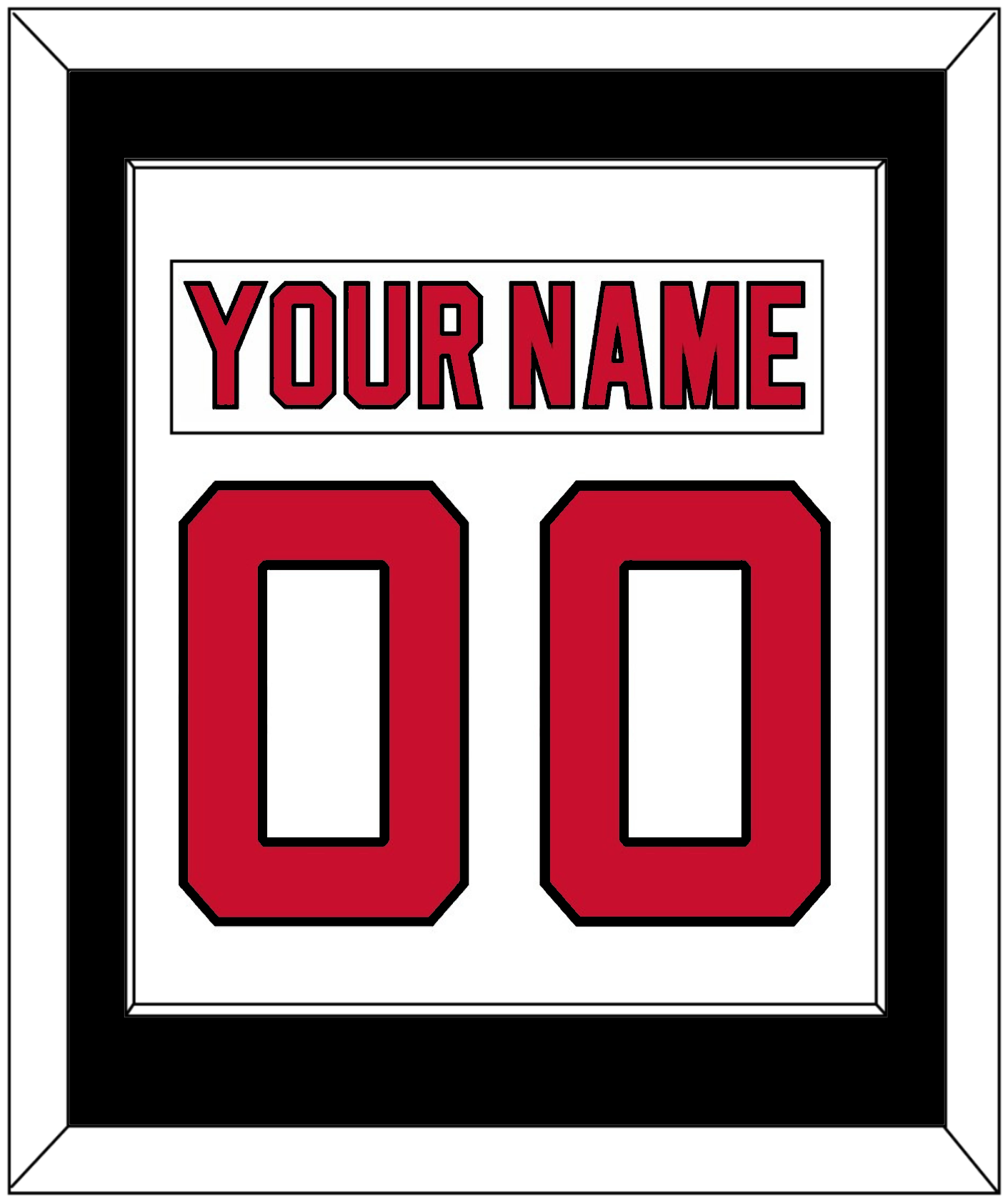 New Jersey Home White Jersey (1992 Through 2007) Nameplate & Number (From The Back Of The Jersey). Single Mat Cut: Black Mat With White Nameplate And Red Number Mounted On A White Mat. White Frame.