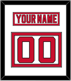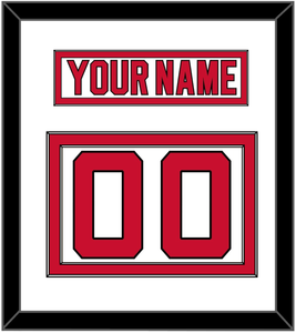 New Jersey Home White Jersey (1992 Through 2007) Nameplate & Numbers (From The Back Of The Jersey). Nameplate Is Single Mat Cut: White Mat With White Nameplate Mounted On A Red Mat. To Match The Jersey, Number Is Double Mat Cut: White Mat Over A Red Mat, Red Number Mounted On A White Mat. Black Frame.