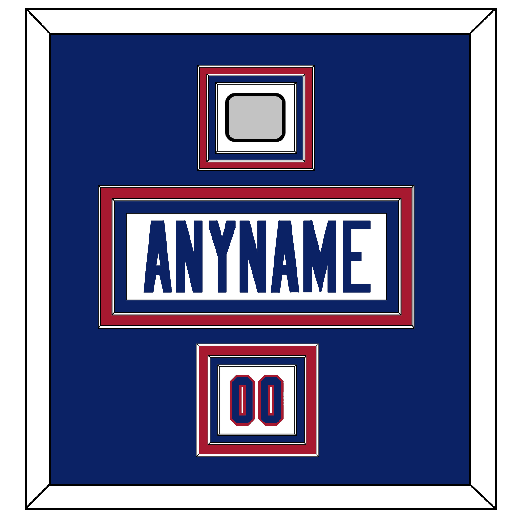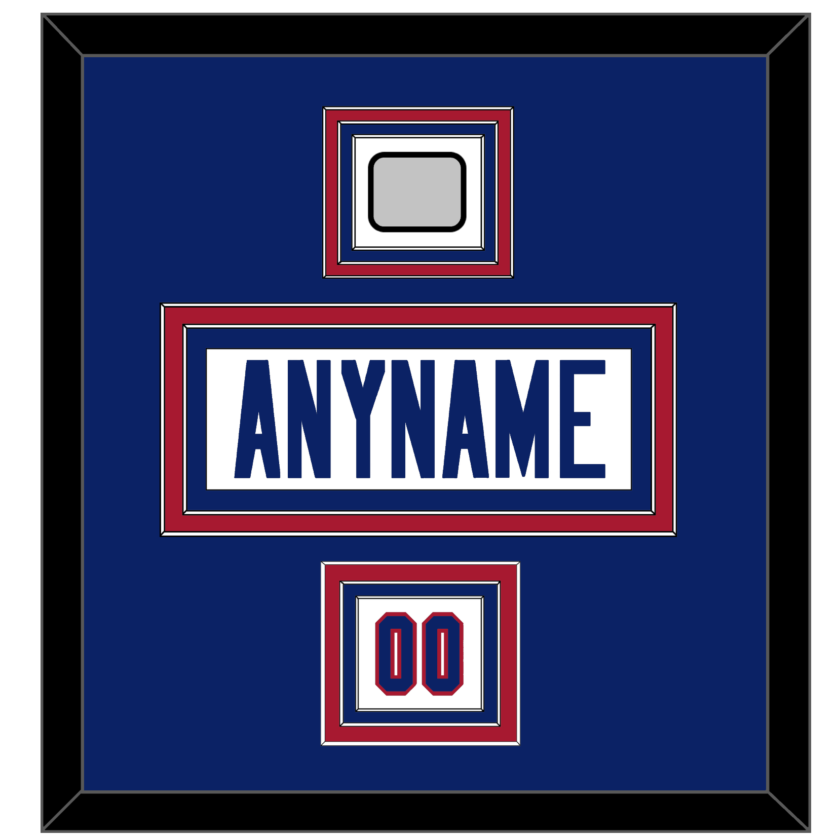 New York Road White Jersey (1980 Through 1988) Nameplate, Number(s) From Shoulder, & Super Bowl XXI Or XXV Jersey Patch. The Nameplate Is Double Mat Cut: Blue Mat Over A Red Mat, White Nameplate Mounted On A Blue Mat. To Match The Jersey, The Numbers & Patches Are Triple Mat Cut: Blue Mat Over A Red Mat Over A Blue Mat, Blue Numbers & Patch Mounted On A White Mat. White Or Black Frame.