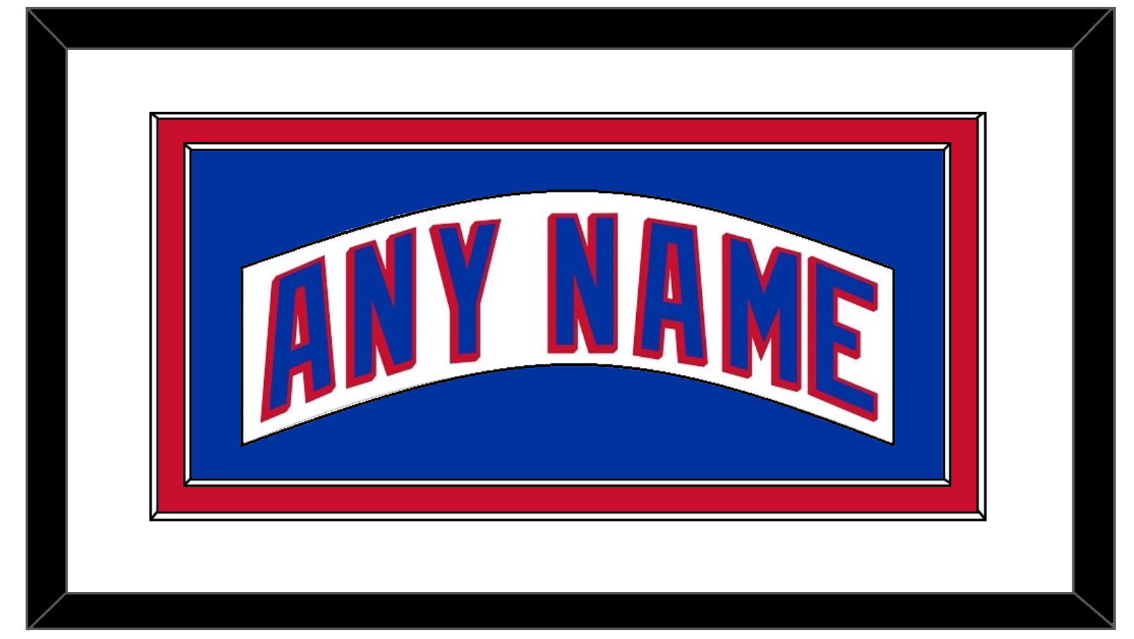 New York Home White Jersey (1990 Through 2004) Nameplate. Double Mat: White Mat Over A Red Mat, White Nameplate Mounted On A Blue Mat. Black Frame.