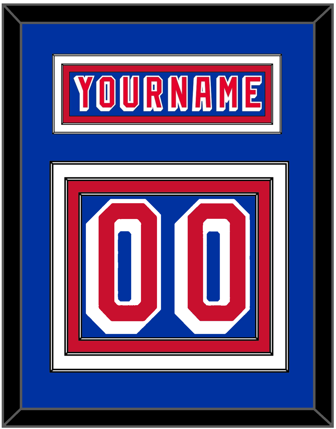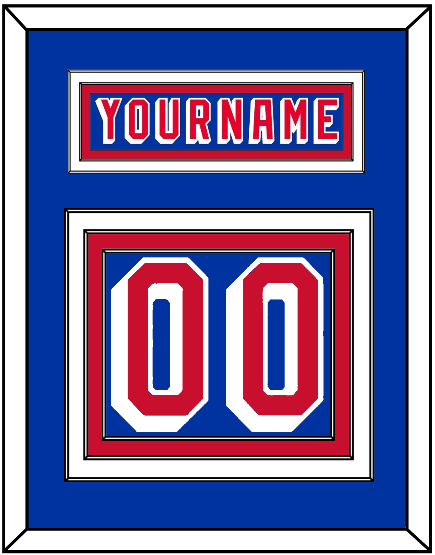 New York Road Blue Jersey (1978 Through 1990) Nameplate & Numbers (From The Back Of The Jersey). Nameplate Is Double Mat Cut: Blue Mat Over A White Mat. Blue Nameplate Mounted On A Red Mat. To Match The Jersey, Number Is Triple Mat Cut: Blue Mat Over A White Mat Over A Red Mat, Red Number Mounted On A Blue Mat. White Or Black Frame.