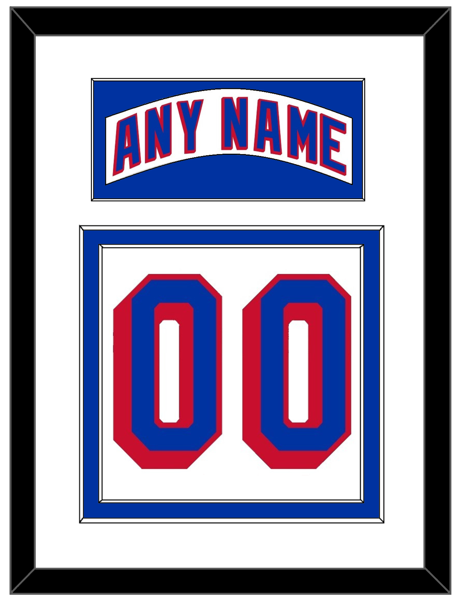 New York Road White Jersey (2004 Through 2017) Nameplate & Numbers (From The Back Of The Jersey).  Nameplate Is Single Mat Cut:  White Mat With White Nameplate Mounted On A Blue Mat.  To Match The Jersey, Number Is Double Mat Cut:  White Mat Over A Blue Mat, Blue Number Mounted On A Blue Mat.  Black Frame.
