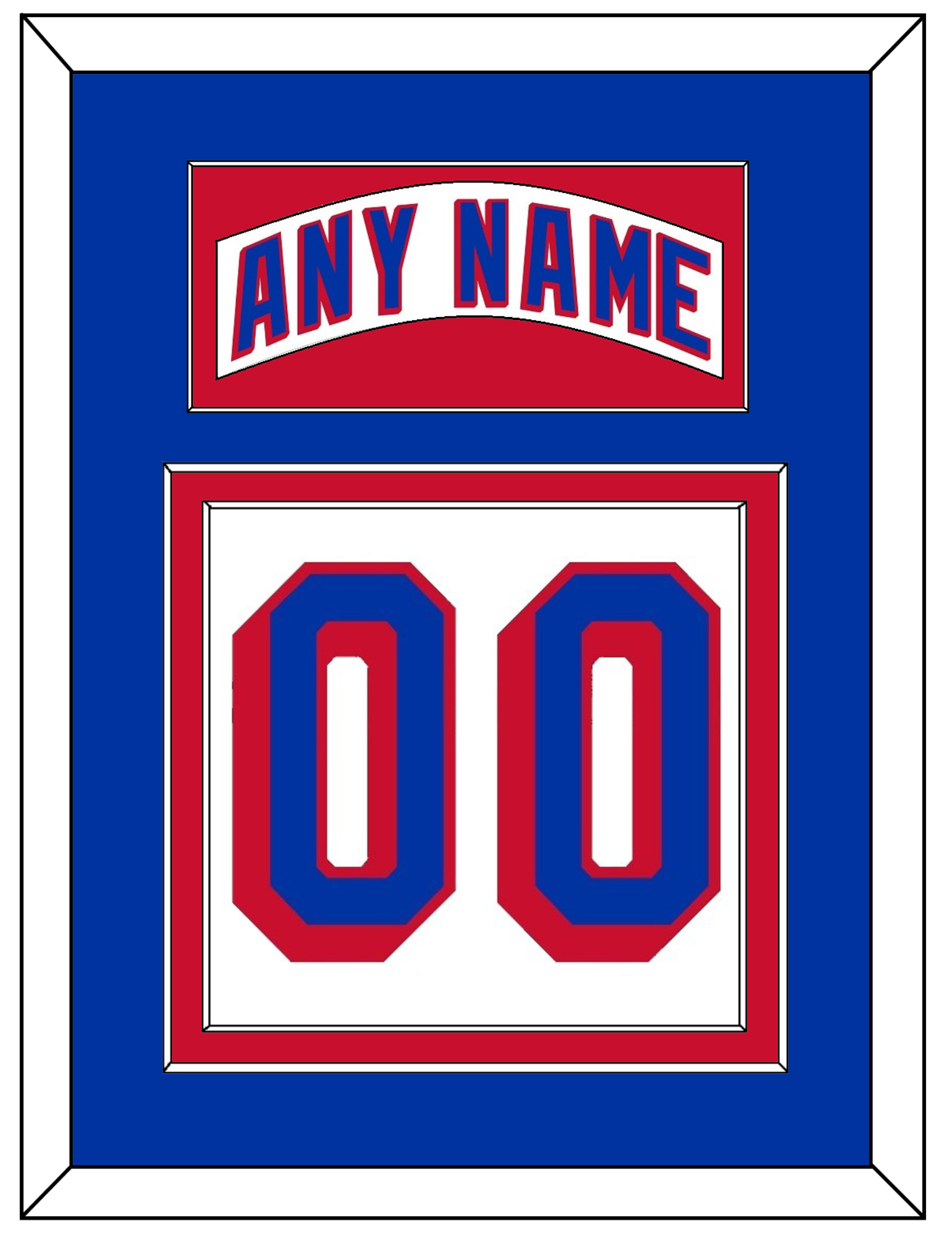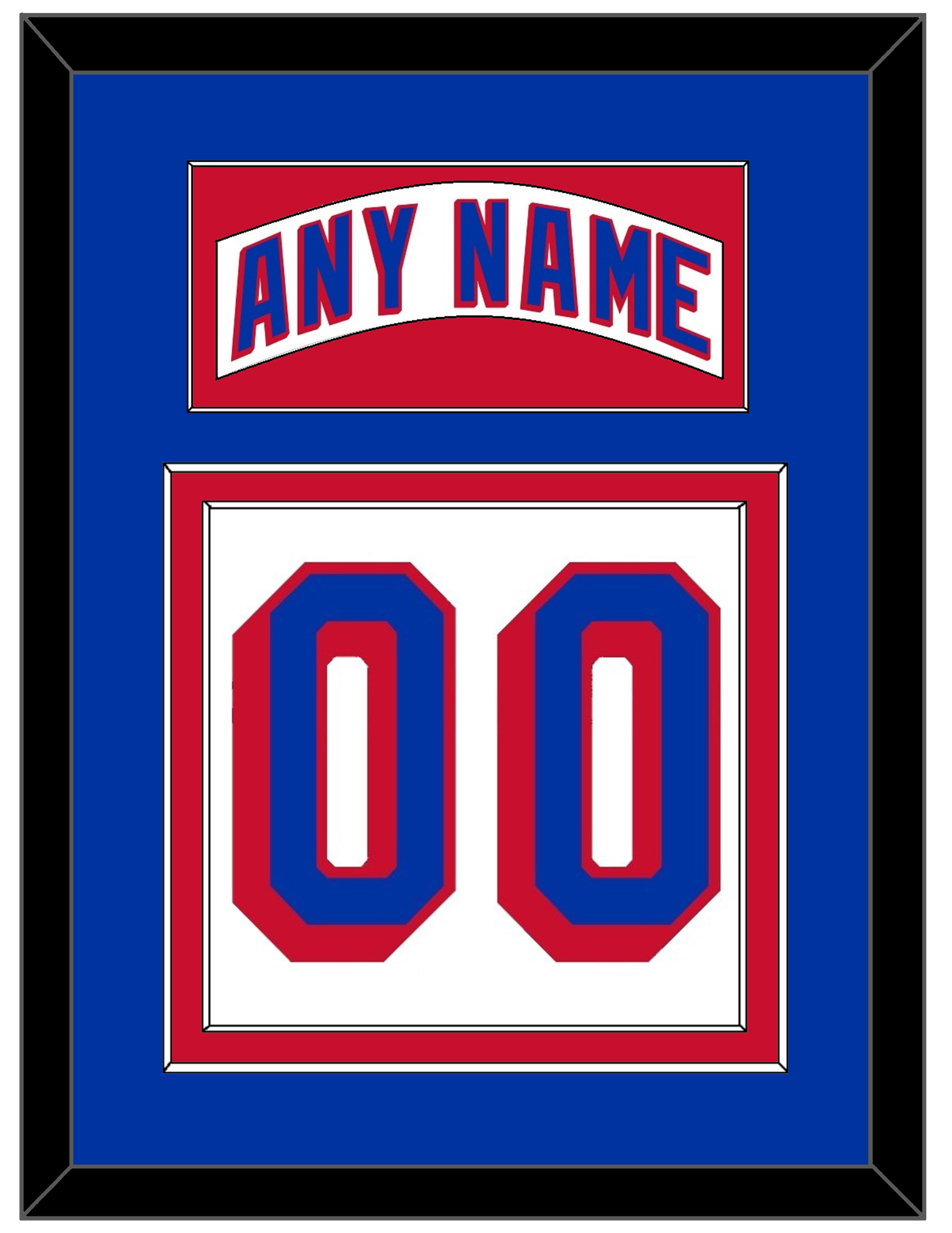 New York Road White Jersey (2004 Through 2017) Nameplate & Numbers (From The Back Of The Jersey).  Nameplate Is Single Mat Cut:  Blue Mat With White Nameplate Mounted On A Red Mat.  To Match The Jersey, Number Is Double Mat Cut:  Blue Mat Over A Red Mat, Blue Number Mounted On A Blue Mat.  White Or Black Frame.
