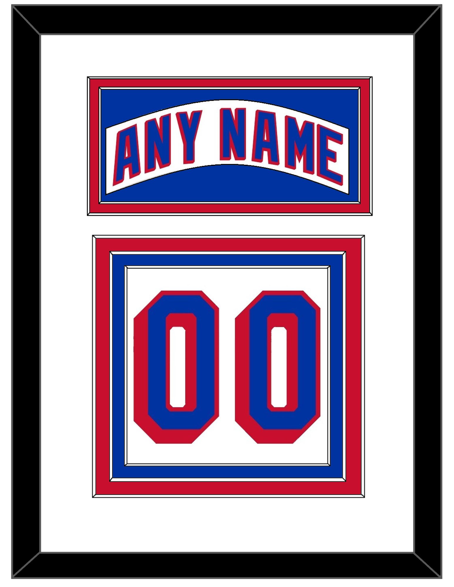 New York Road White Jersey (2004 Through 2017) Nameplate & Numbers (From The Back Of The Jersey). Nameplate Is Double Mat Cut: White Mat Over A Red Mat. White Nameplate Mounted On A Blue Mat. To Match The Jersey, Number Is Triple Mat Cut: White Mat Over A Red Mat Over A Blue Mat, Blue Number Mounted On A White Mat. Black Frame.