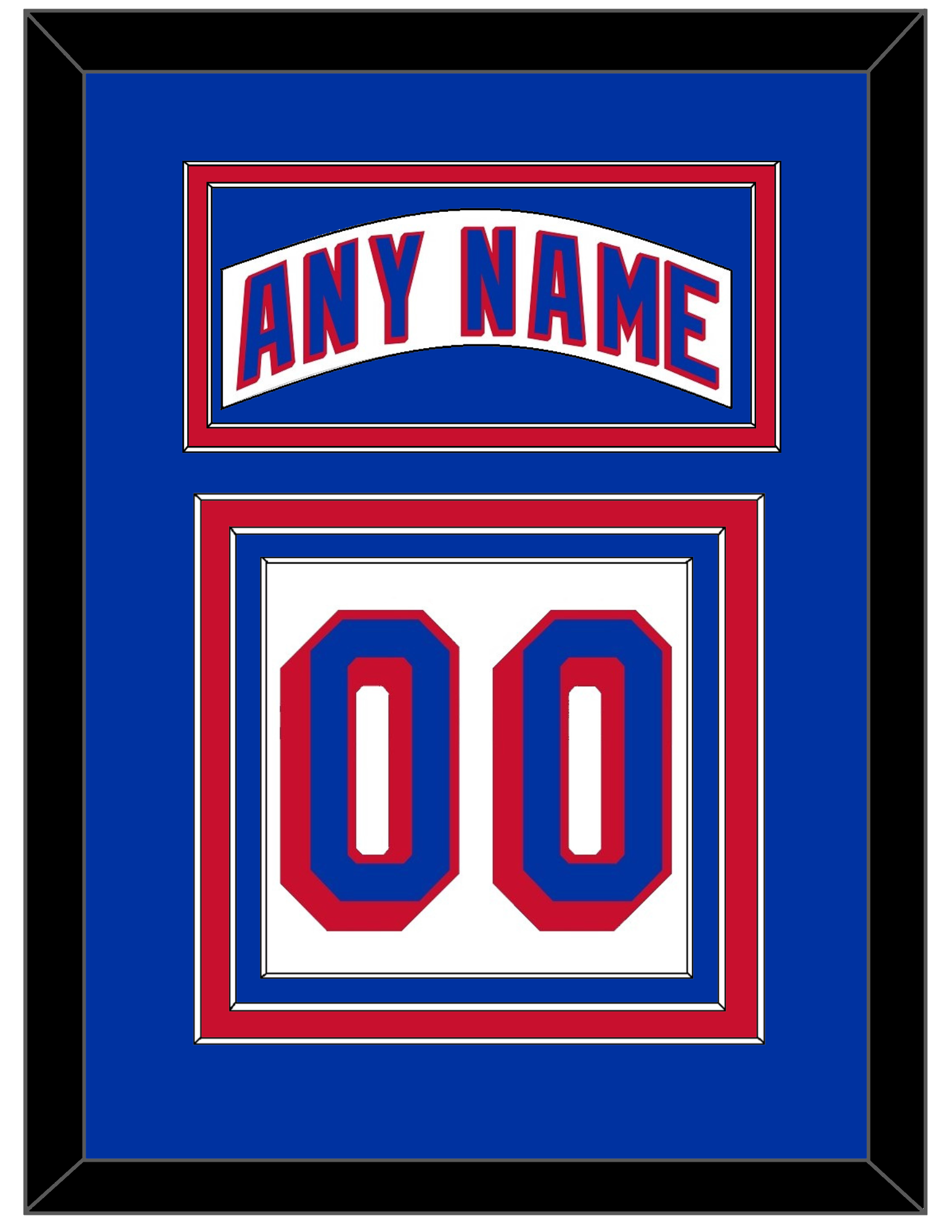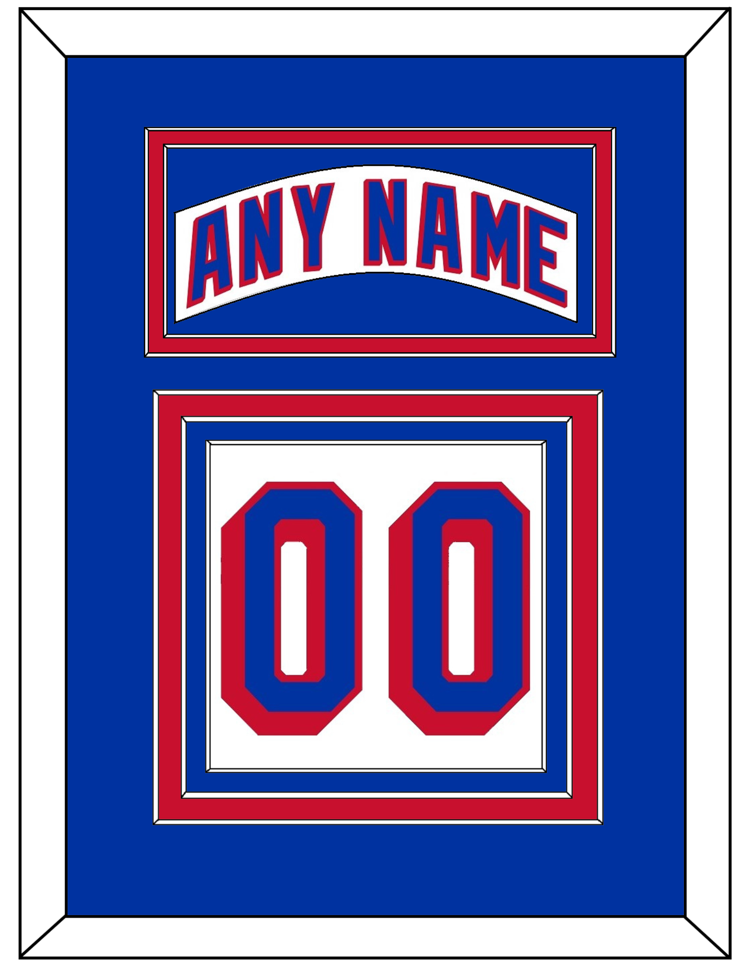 New York Road White Jersey (2004 Through 2017) Nameplate & Numbers (From The Back Of The Jersey). Nameplate Is Double Mat Cut: Blue Mat Over A Red Mat. White Nameplate Mounted On A Blue Mat. To Match The Jersey, Number Is Triple Mat Cut: Blue Mat Over A Red Mat Over A Blue Mat, Blue Number Mounted On A White Mat. White Or Black Frame.