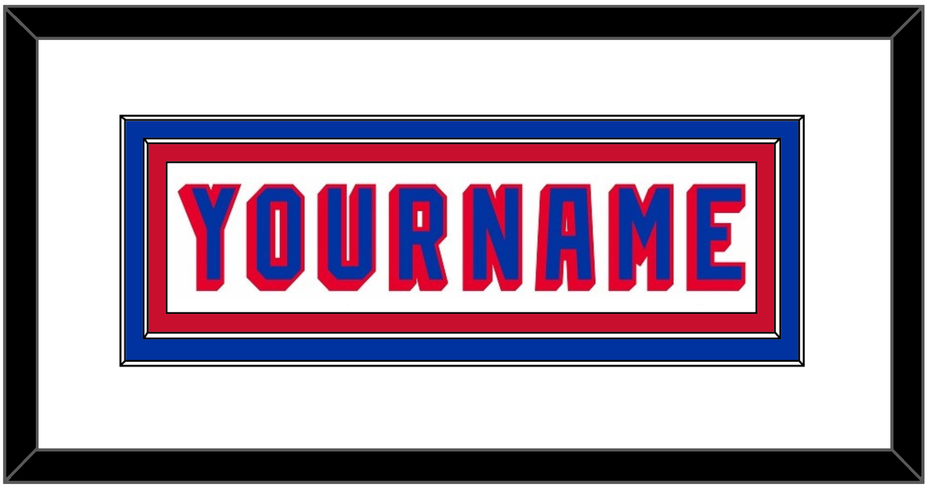 New York Home White Jersey (1978 Through 1990) Nameplate.  Double Mat:  White Mat Over Blue Mat, White Nameplate Mounted On Red Mat.  Black Frame.