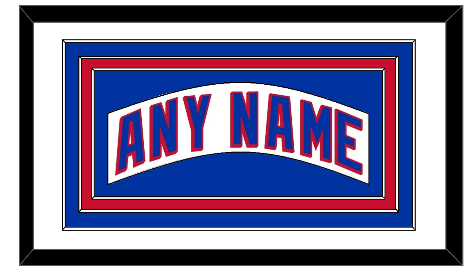 New York Home White Jersey (1990 Through 2004) Nameplate. Triple Mat: White Mat Over Blue Mat Over A Red Mat, White Nameplate Mounted On A Blue Mat. Black Frame.