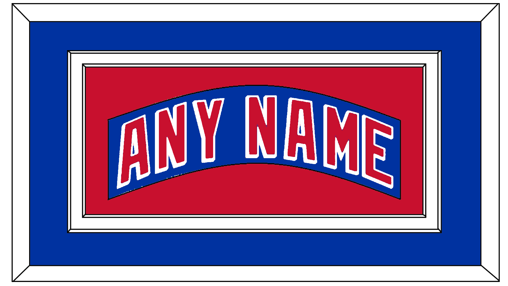 New York Road Blue Jersey (1990 Through 2004) Nameplate. Double Mat: Blue Mat Over White Mat, Blue Nameplate Mounted On Red Mat. White Or Black Frame.