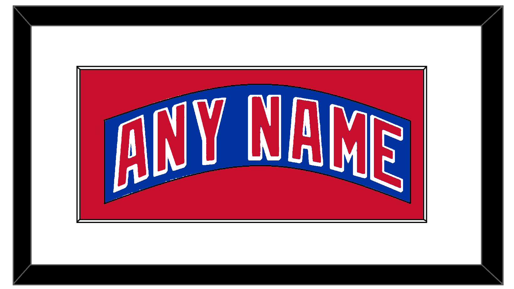 New York Road Blue Jersey (1990 Through 2004) Nameplate. Single Mat: White Mat, Blue Nameplate Mounted On Red Mat. Black Frame.